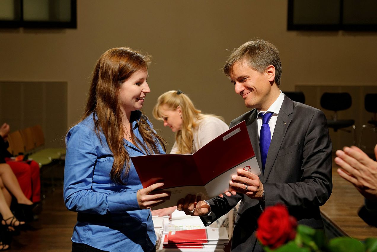 Zahlreichen Absolventinnen und Absolventen wurde am 21. Oktober 2014 im Rahmen einer Feier im Heilig-Geist-Saal ihr Abschlusszeugnis überreicht. Der Präsident der Hochschule, Prof. Dr. Martin Ullrich, die Vizepräsidentin, Prof. Dr. Renate Reitinger, und der Vizepräsident, Prof. Alfons Brandl, beglückwünschten die erfolgreichen Studierenden persönlich und überreichten neben den offiziellen Dokumenten jedem Absolventen und jeder Absolventin eine Rose. Felix Gerhart verabschiedete seine scheidenden Mitstudierenden im Nahmen des Studentischen Konvents mit einem launigen Grußwort und ermunterte sie, in der Gesellschaft Präsenz zu zeigen. Musikalisch umrahmt wurde die feierliche Veranstaltung, zu der auch etliche Angehörige gekommen waren, mit Kammermusik und einer Gesangseinlage. Teresa Novàk (Violine), Sofia Kurek (Viola), Martin Matos Mendoza (Violoncello) und Patrik Hévr (Klavier) spielten Klavierquartette von Mozart und Mahler. Isabel Blechschmidt (Sopran) und Philip Carmichael (Tenor) boten in Begleitung von Liliana Michelsen de Andrade (Klavier) Auszüge aus La Bohéme und Die Fledermaus. Bei einem Sektempfang im Foyer konnte der Abend feierlich ausklingen.