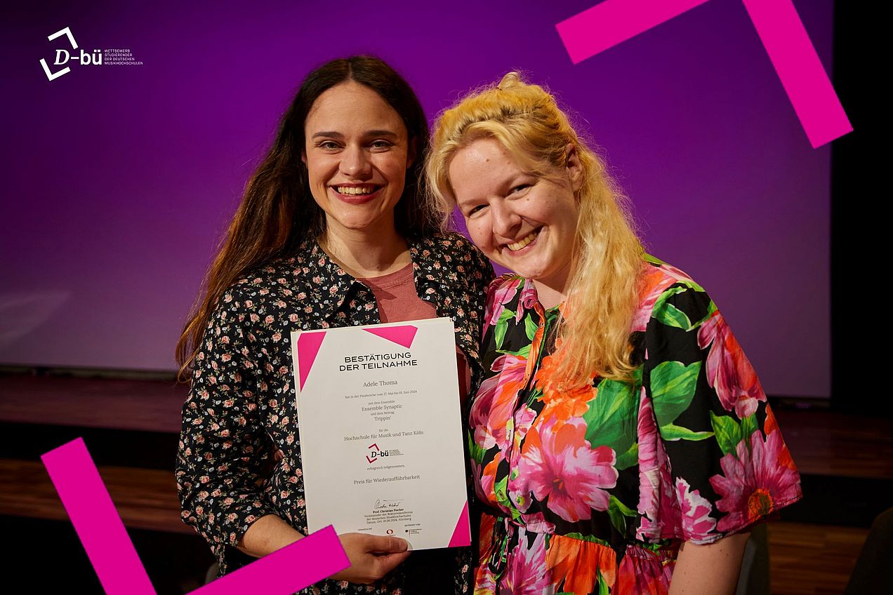 Der Preis für Wiederaufführbarkeit geht an das Ensemble Synaptic aus Köln mit ihrer Aufführung »Trippin‘« am 29.05. im Heizhaus. Sie stellten in ihrem Konzert die Frage, wie wir in unserer Gesellschaft mit psychischen Krisen umgehen. Das Duo aus Klavier und Gesang beeindruckte durch eine außergewöhnlich runde Gesamtdramaturgie. Es wurden hochrelevante gesellschaftliche Themen behandelt sowie aktuelle Medienformate mit klassischem und neuem Repertoire verschränkt. Das und die musikalische und darstellerische Gesamtqualität überzeugten die Jury.