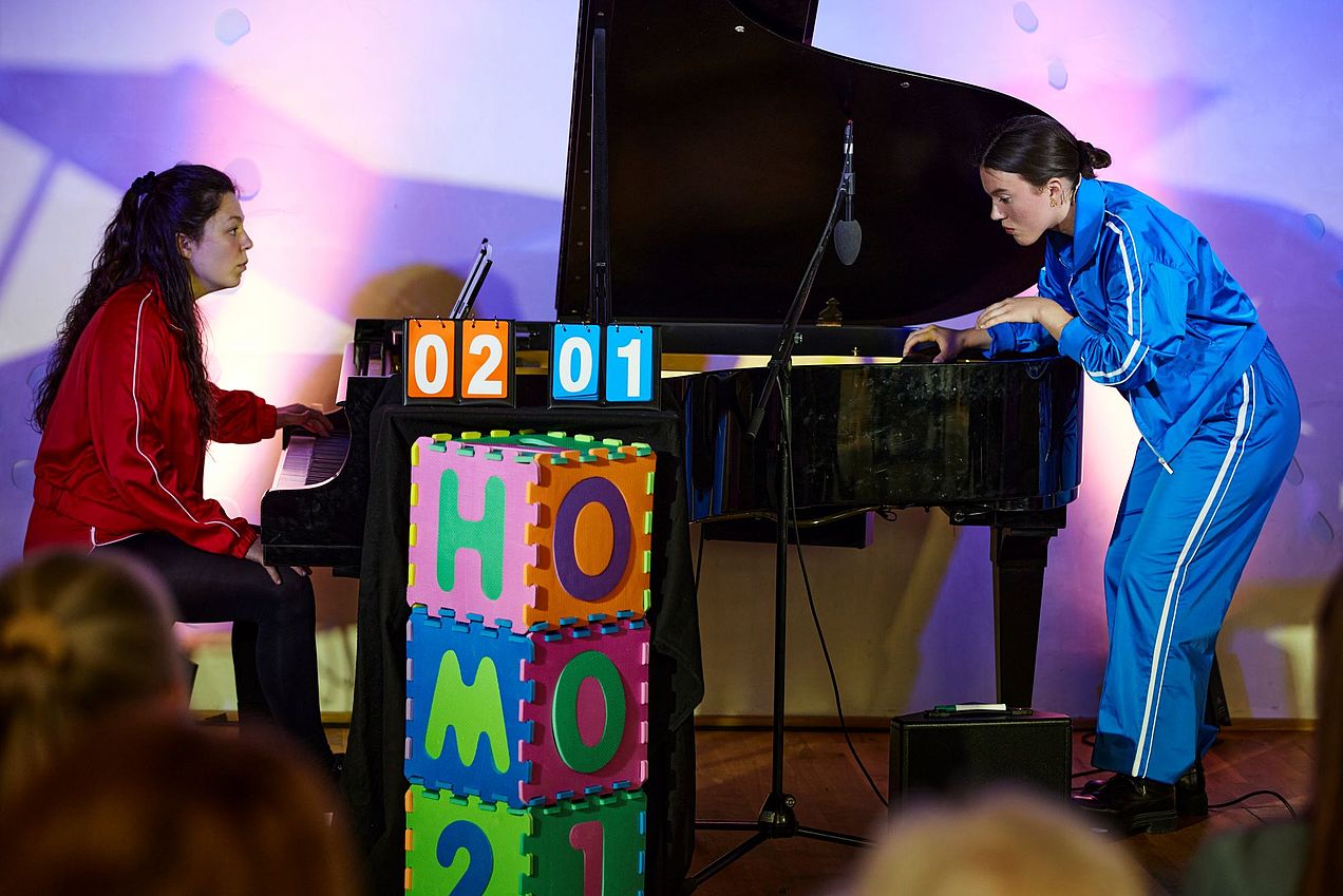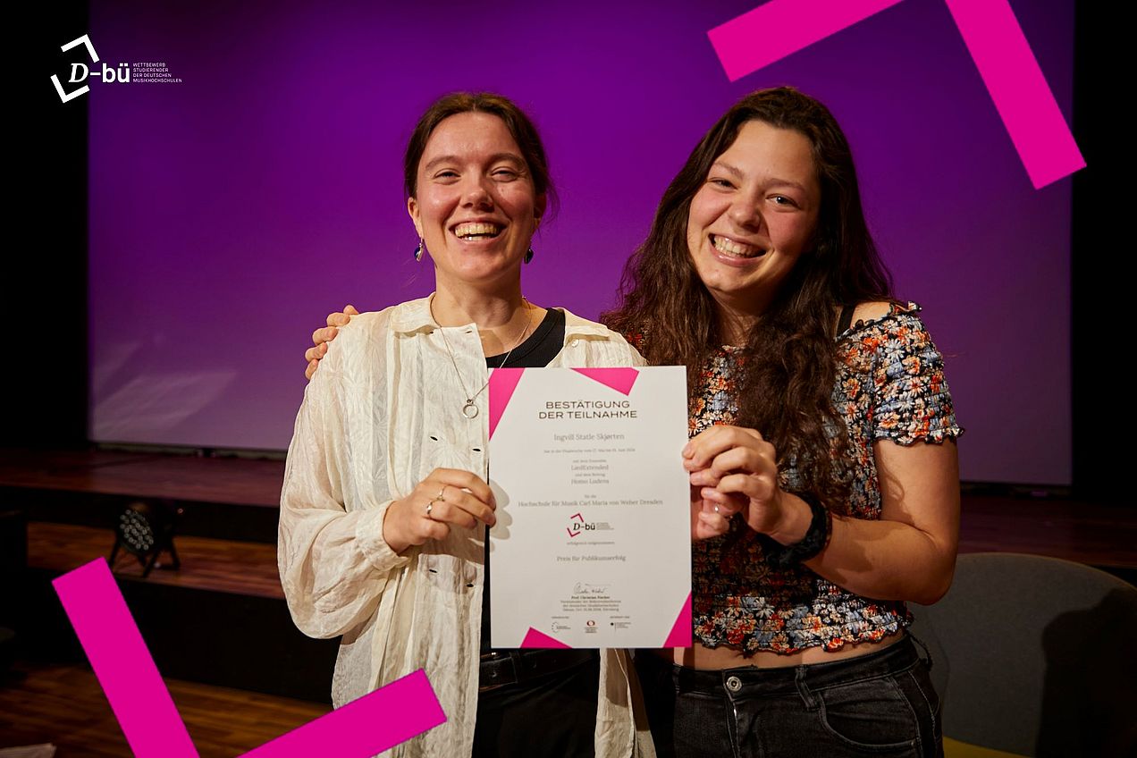 Der Preis für Publikumserfolg geht an das Duo LiedExtended aus Dresden mit ihrer Aufführung »Homo Ludens« am 29.05. im Sophiensaal. Alles stand im Zeichen des Spiels. Durch eine direkte persönliche Begrüßung sowie die gelungene Inszenierung innovativer Partizipationsformate sorgten die Künstlerinnen für eine intime, warme Konzertatmosphäre. Die Virtuose Darstellung mit Stimme, Körper und Klavier und das originelle Vermittlungskonzept machten das Programm zu einem echten Genuss.