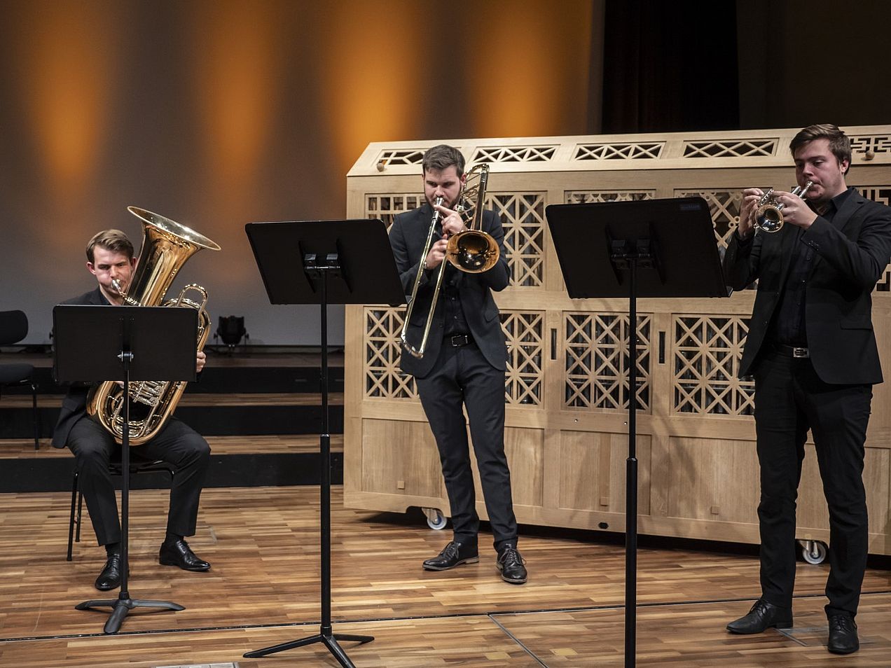 Das Konzert begann im Foyer, die Musik erklang von der Empore herab, wo die Orgel aufgebaut war. Marc-Antoine Charpentiers Prelude aus dem „Te Deum“, bearbeitet für Bläserquintett und Orgel, bot einen wirkungsvollen Einstieg.