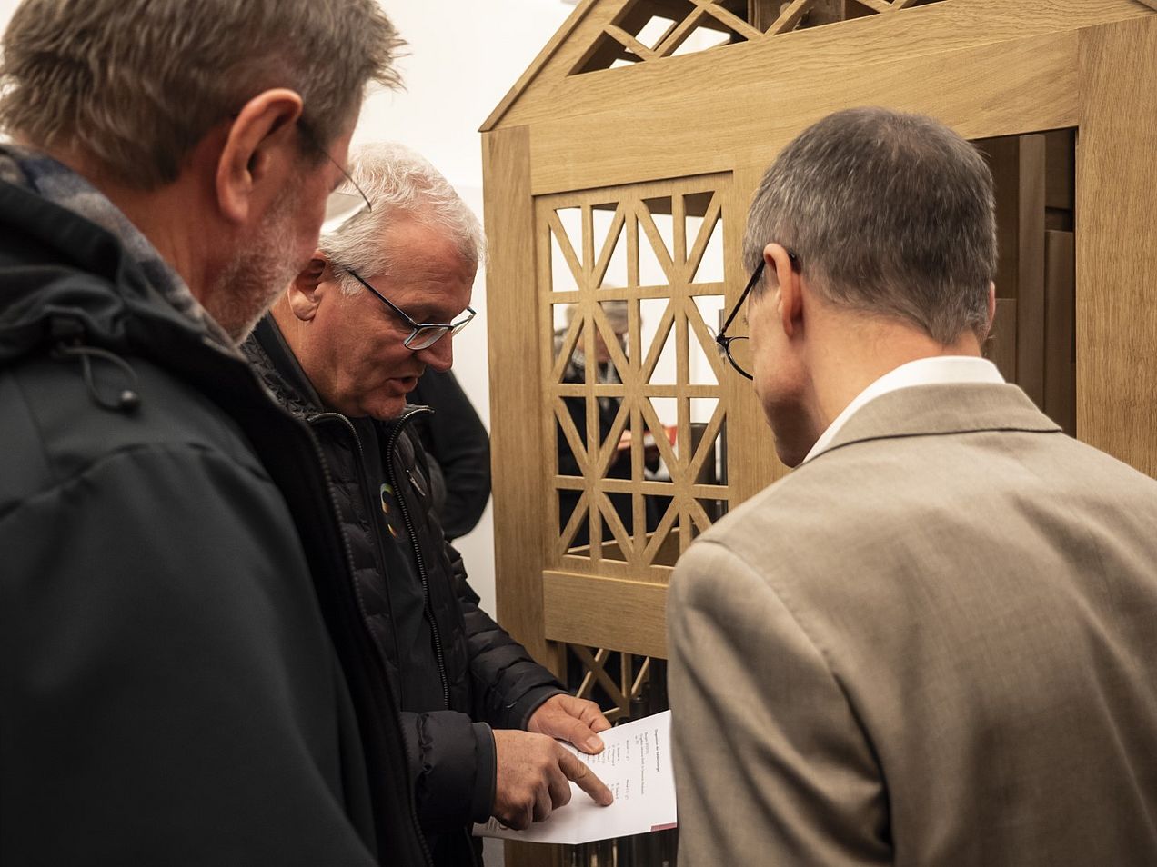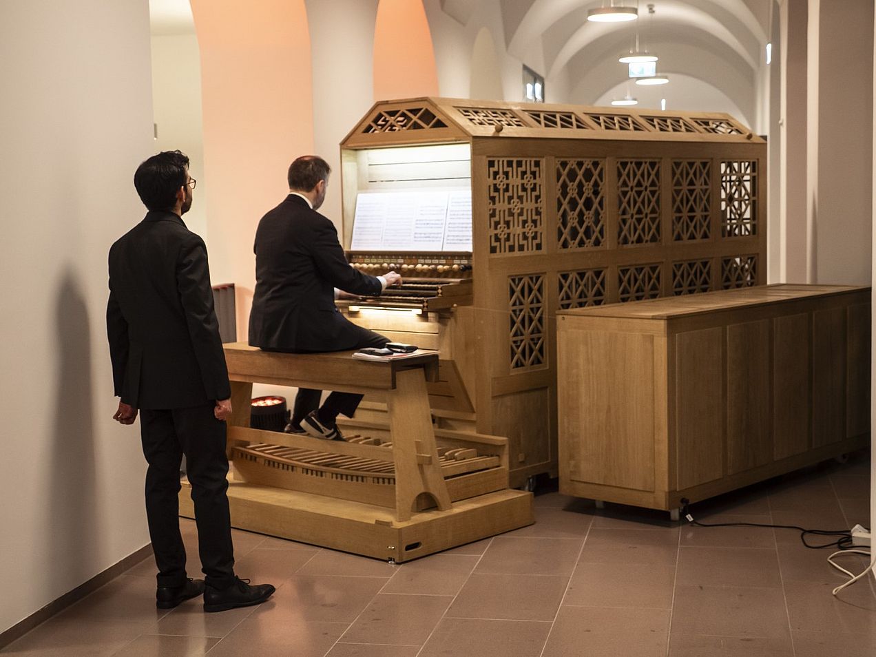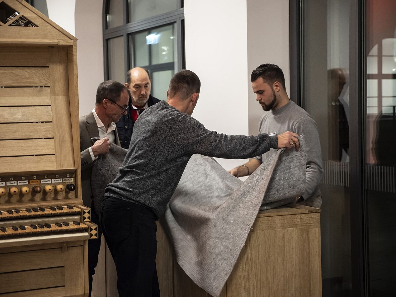 Nach einem weiteren Transport in den Orgel-Unterrichtsraum endete die Veranstaltung mit einem kleinen Abendständchen. Im Anschluss bot sich Gelegenheit, Prof. Willinger und den Orgelbauern Fragen zu stellen und das Instrument eingehend aus nächster Nähe zu betrachten.