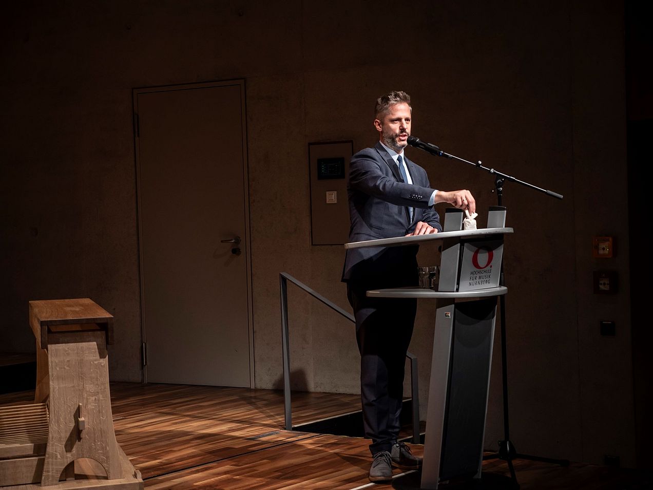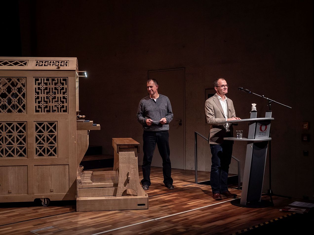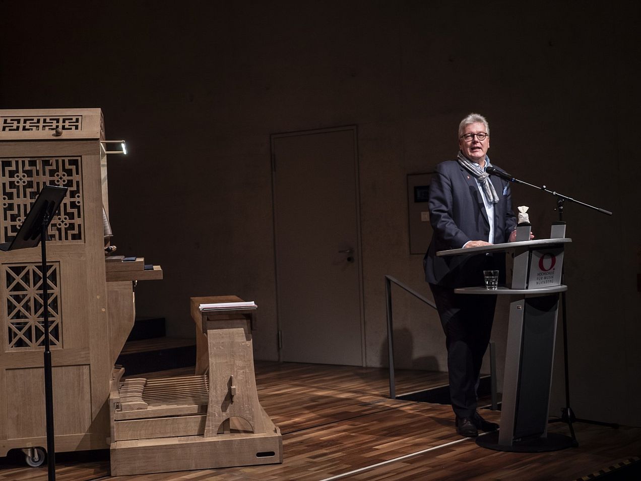 Grußworte von Hochschulpräsident Prof. Rainer Kotzian, den Orgelbauern Tobias Merkle und Thomas Dehmel sowie dem Vorsitzenden des Vorstands der Zukunftsstiftung der Sparkasse Nürnbger, Dr. Matthias Everding ergänzten den Festakt. Ein besonderer Dank gilt der Zukunftsstiftung, die den Kauf dieses einzigartigen und für die Hochschule so wichtigen Instruments mit 120.000 Euro unterstützt hat.