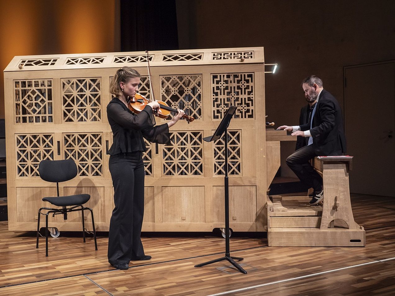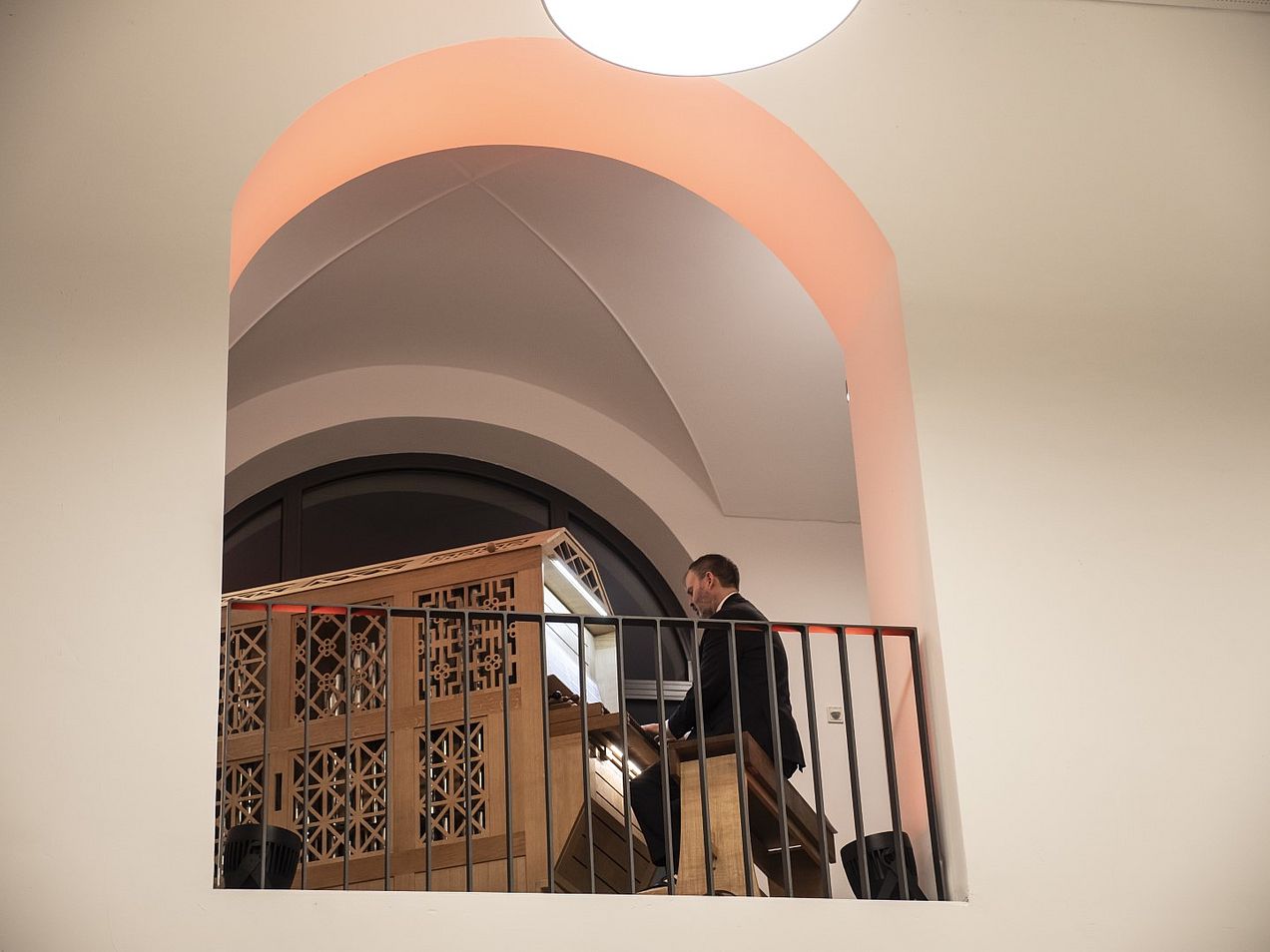 Im zweiten Teil, dann im Orchestersaal, erstreckte sich die musikalische Bandbreite von Monteverdi (1567–1643) bis zur zeitgenössischen Musik mit solistischen Werken von Sofia Gubaidulina und Arvo Pärt. So konnte Prof. Willinger in verschiedenster Begleitung (u.a. von einem Bläserquintett und einem Kammerorchester unter der Leitung von Prof. Guido Rumstadt) die eindrucksvolle Orgel in all ihren Facetten vorstellen.