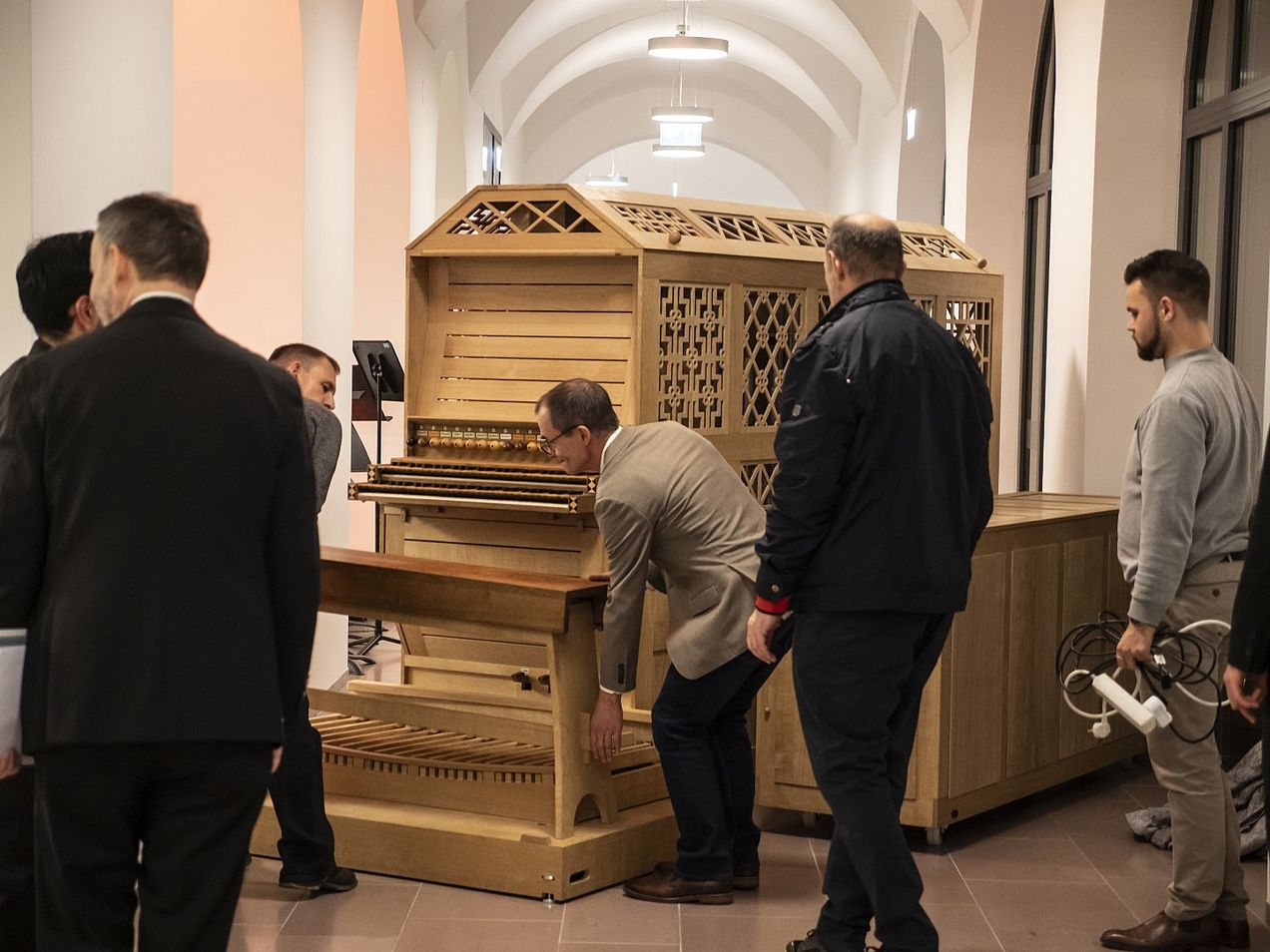 Das Besondere an unserer Baldachinorgel aus der Werkstatt von Orgelbaumeister Johannes Rohlf ist ihre Kompaktheit und die Mobilität. Deshalb gehörte der Transport von der Empore in den Orchestersaal sozusagen mit zum Konzert, um den anwesenden Festgästen und Medienvertreter*innen die Fahrbarkeit des Intruments zu demonstrieren.