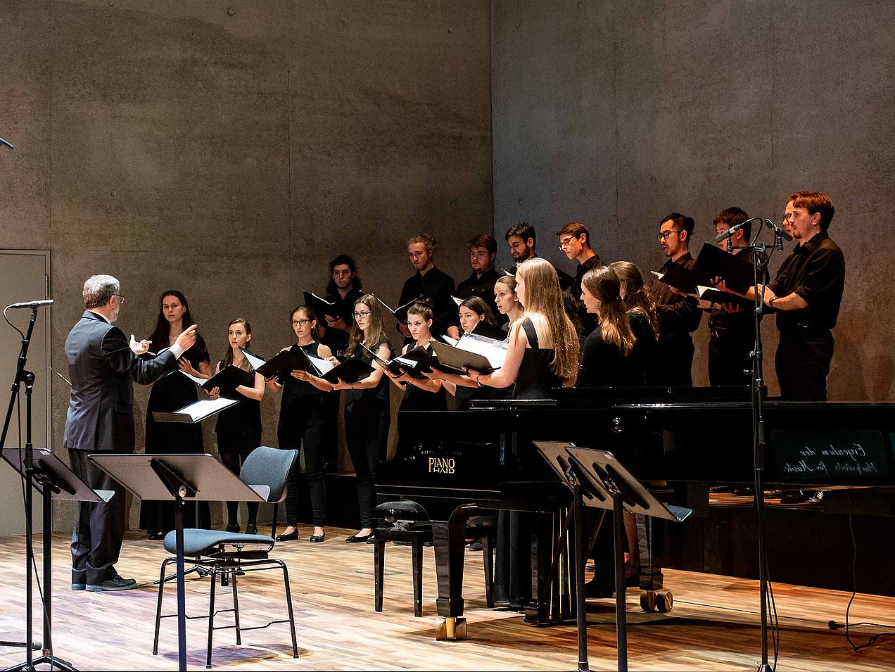 Nach vier intensiven Probentagen führte ein Ensemble des Hochschulorchesters am 29. April vier Ensemblekompositionen auf: als Uraufführungen zwei groß besetzte Werke der Kompositionsstudierenden Hanqiong Xie (HfM Nürnberg) und Mert Morali (HfM Hanns Eisler Berlin) und – zusammen mit den Solistinnen Thurid Pribbernow, Violine und Alexandra Köhler, Sprecherin – aktuelle Stücke der Komponistinnen Eun-Hwa Cho und Brigitta Muntendorf. Die Dirigierstudierenden Lisa Pösse, Ètienne Lemieux-Despres und SeungHyun Baek (Klasse Prof. Guido J. Rumstadt) leiteten die Proben in Zusammenarbeit mit dem Dirigenten Prof. Manuel Nawri (HfM Hanns Eisler Berlin, HfM Saar). Prof. Nina Janßen-Deinzer unterstützte während der Probenarbeit die Instrumentalistinnen und Instrumentalisten bei allen Spezialfragen zu Spieltechniken neuer Musik. Mit einem Seminar und einer Meisterklasse für die Kompositionsstudierenden wurde der Austausch der Kompositionsklassen Prof. Eun-Hwa Cho (Hochschule für Musik Hanns Eisler Berlin) und Prof. Peter Gahn (Hochschule für Musik Nürnberg) abgerundet.