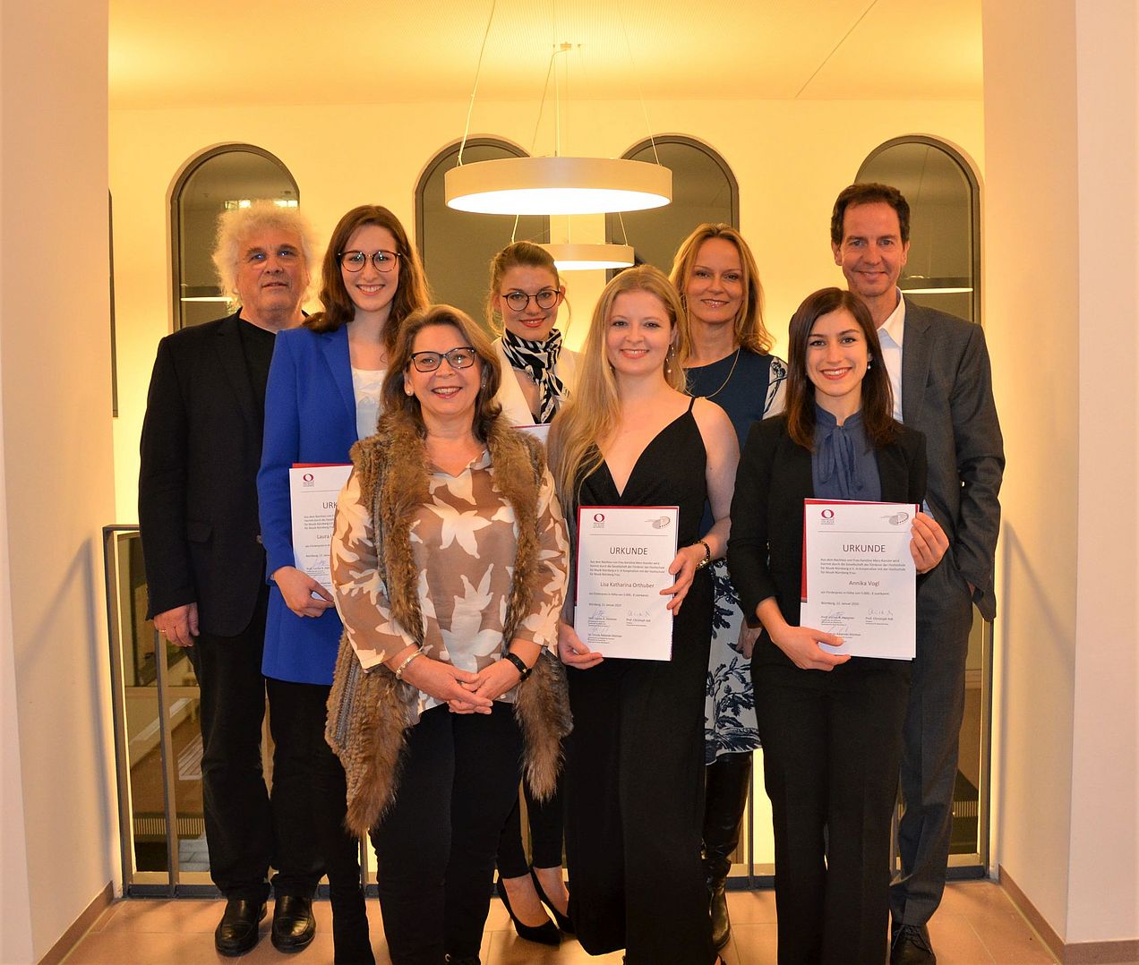 Die Preise der Gesellschaft der Förderer der Hochschule für Musik Nürnberg e. V., welche Frau Merz-Kanzler der Fördergesellschaft als Erbe hinterlassen hatte, erhielten die Studierenden Annika Vogl, Laura Irmengard Braun, Mara Maria Möritz und Lisa Katharina Orthuber in Anwesenheit des Hochschulpräsidenten Prof. Christoph Adt und der Vizepräsidentin Prof. Susanne Kelling. Überreicht wurden diese von dem Vorsitzenden des Vorstands der Gesellschaft der Förderer der Hochschule für Musik Nürnberg e. V. Prof. Lucius A. Hemmer in Begleitung der Leiterin der Öffentlichkeitsarbeit der Gesellschaft der Förderer Dr. Adamski-Störmer.