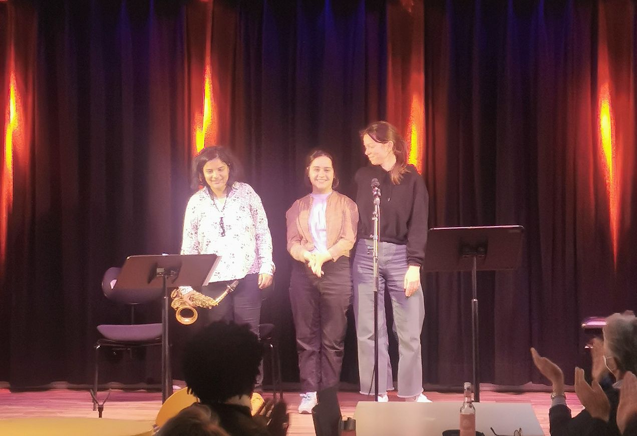 Das anschließende Konzert dreier Jazz-Studentinnen der HfM zeigte, welch inspirierende, musikalische und kompetente Musikerinnen die HfM Nürnberg ausbildet. Sabrina Janine Wierschin (Gesang), Sandrine Ramamonijsoa (Saxophon) und Anastasija Sanina (Piano) begeisterten das Publikum mit einem kurzen Set von sechs Standards. Unter anderem spielten und sangen sie Hits wie „Love me or Leave me“ und „On the sunny side of the street“. Sabrina Wierschins lockere Moderation führte das Publikum in angenehmer Atmosphäre durch das Konzert.