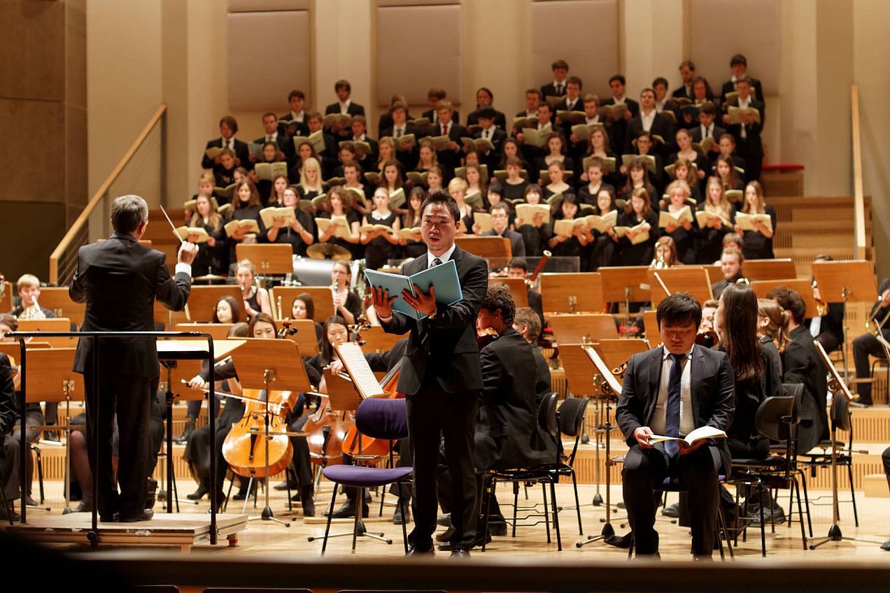 Doch auch die zweite Instrumentalsolistin konnte mit ihrer Virtuosität überzeugen. Ai Koda aus der Geigenklasse von Prof. Daniel Gaede spielte den Solo-Part in Ravels"Tzigane". "Ob haarige Flageoletts oder vertrackte Akkordgriffe: Die technische Brillanz der 23-Jährigen ist bemerkenswert", schreibt Voskamp.