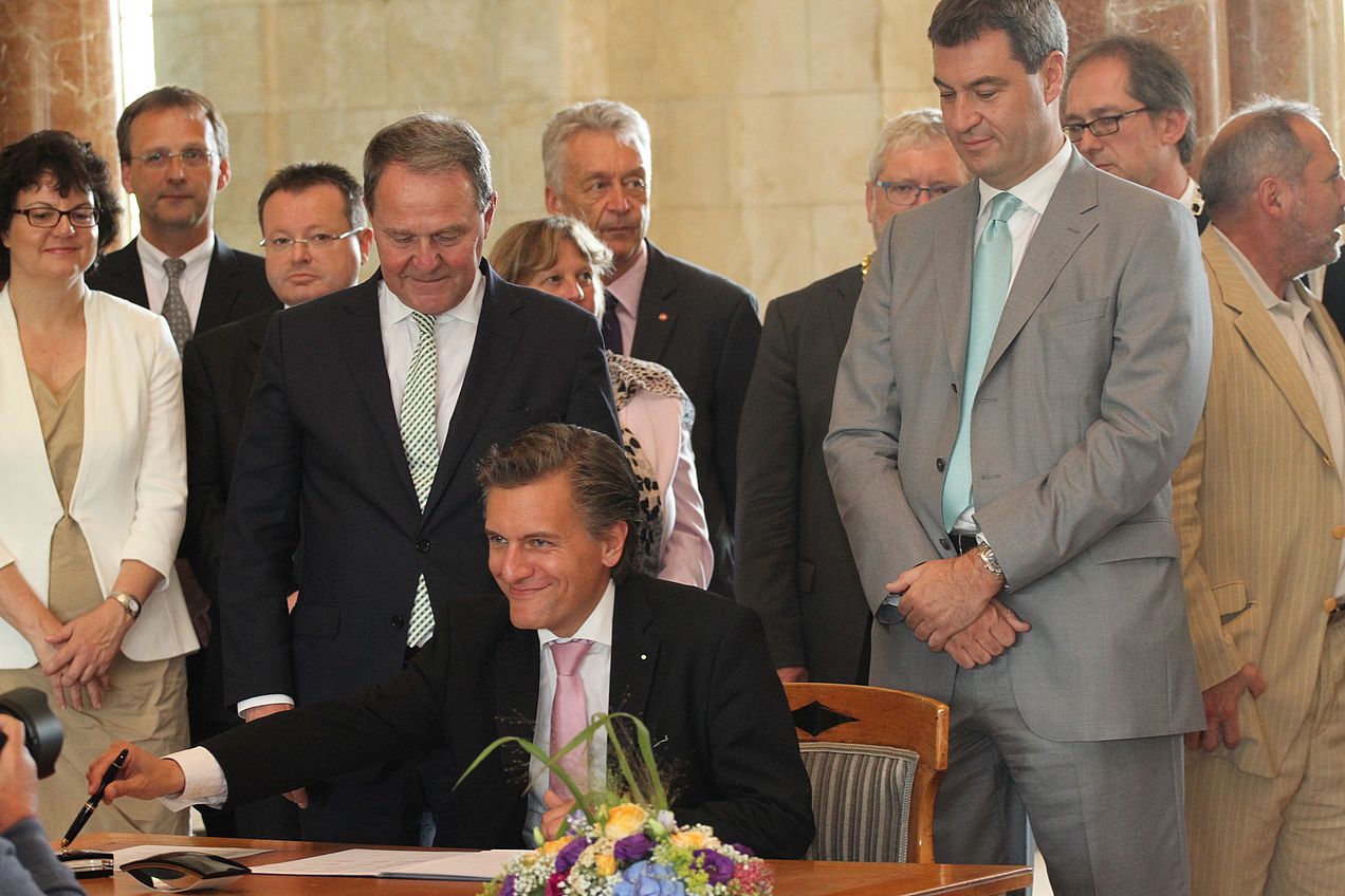 Die Staatsregierung und die bayerischen Hochschulen haben am 8. Juli 2013 mit dem Abschluss des Innovationsbündnisses „Hochschule 2018" die hochschulpolitischen Ziele der kommenden fünf Jahre festgelegt. An der Unterzeichnung der Rahmenvereinbarung in der Staatskanzlei nahmen neben Wissenschaftsminister Wolfgang Heubisch und Finanzminister Markus Söder alle bayerischen Hochschulpräsidentinnen und -präsidenten teil. Das Innovationsbündnis „Hochschule 2018" ist die dritte Vereinbarung dieser Art. Erstmalig sind darin auch die Kunsthochschulen des Freistaats aufgenommen.