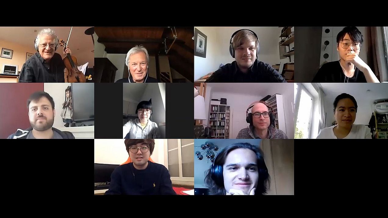 Ein geplantes Seminar/Konzert mit Irvine Arditti, dem Begründer des Arditti-Quartetts (http://www.ardittiquartet.co.uk/biogirv.htm), und den international besetzten Kompositionsklassen der Hochschulen von Würzburg (Prof. Robert HP Platz) und Nürnberg (Prof. Peter Gahn) wurde durch Corona zum Online-Seminar. Arditti diskutierte und spielte alle Stücke der jungen Komponist_innen.