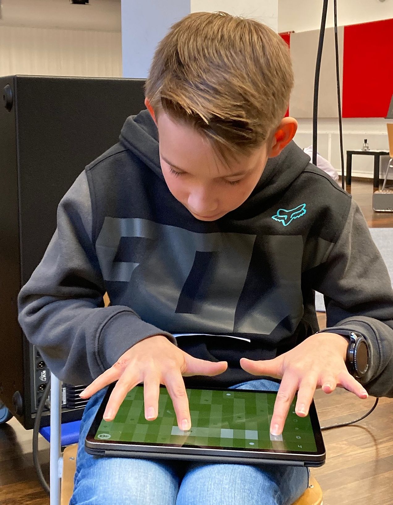 Dr. Markus Sommerer, langjähriger Lehrbeauftragter für Musikpädagogik/Musiktherapie, erprobte mit den jungen Forscher_innen ein digitales Instrument, die sog. Audanika. Auf Tablet-Computern wurde mit Hilfe dieser speziell programmierten Software zunächst mittels verschiedener Improvisationsaufgaben spontan gemeinsam musiziert. Im zweiten Teil konnten die Kinder dann auch aktuelle Hits nachspielen, gemeinsam arrangieren und für die Abschlussperformance proben. Diese musste dann gleich zweimal aufgeführt werden, da das begeisterte Publikum nach einer Wiederholung verlangte. Großartig!