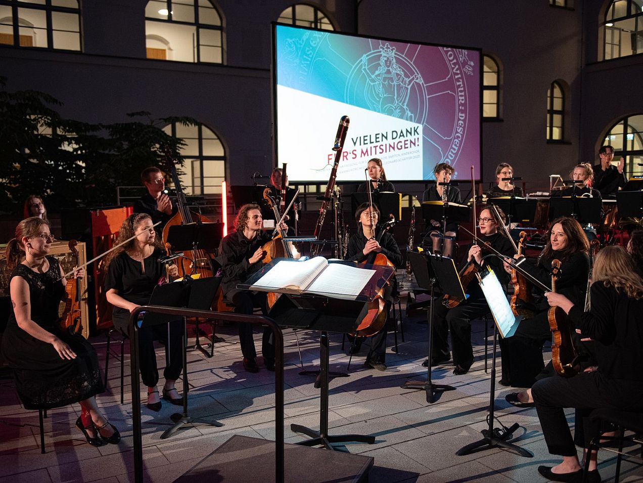 Die Solistinnen und Solisten entstammten den Gesangsklassen der Hochschule, das Orchester wurde von Instrumentalistinnen und Instrumentalisten der HfM gebildet. Den groß besetzten Chor bildeten über zweihundert Sängerinnen und Sänger aus der gesamten Metropolregion Nürnberg, die sich projektweise mit den Mitgliedern des Hochschulchors zusammengeschlossen hatten.
