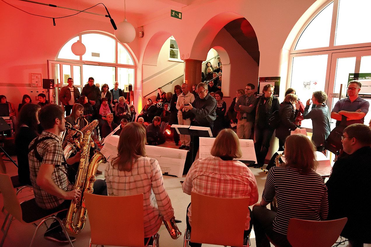 Die Hochschule für Musik Nürnberg hat auch in dieser langen Nacht wieder das ganze Haus zum Klingen gebracht! In zahlreichen Programmpunkten war das Publikum auf eine Reise durch die Musikgeschichte von der Renaissance bis zur Gegenwart eingeladen. Bei wissenschaftlichen und künstlerischen Vorträgen, offenem Unterricht, Gesprächskonzerten sowie Performances und Installationen konnte die ganze Bandbreite der Hochschulausbildung erlebt werden. Viele Musikerinnen und Musiker haben die räumliche Situation in die musikalische Darbietung mit einbezogen und zum Beispiel das Treppenhaus, den Aufzug im Südflügel und den Innenhof bespielt. Dies führte zu spannenden Gegenüberstellungen von verschiedenen klanglichen Eindrücken innerhalb des Hauses.