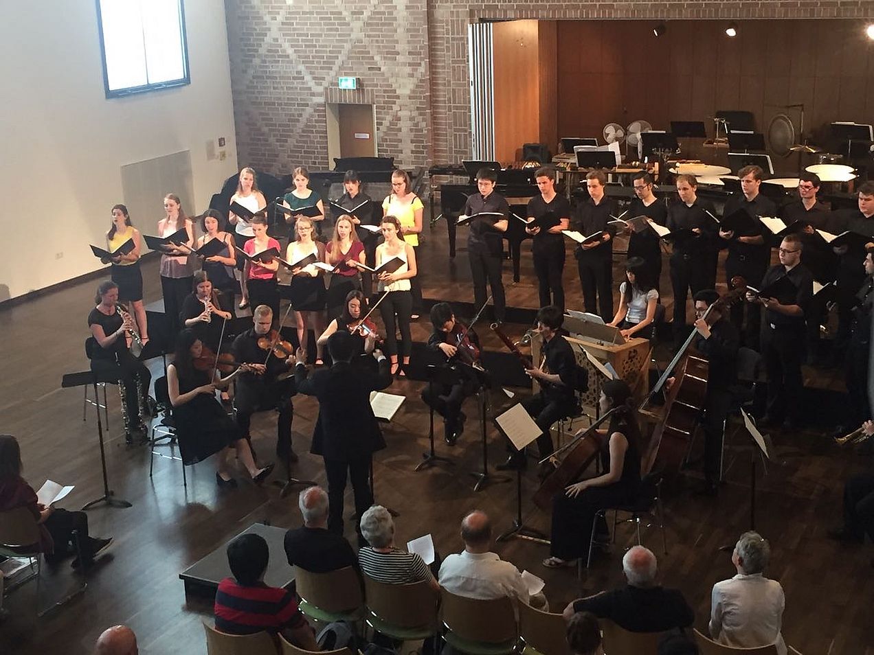 Im Rahmen seiner Masterarbeit dirigierte Fang Zhang (Klasse Prof. Alfons Brandl) zunächst die Bach-Kantate „Herz und Mund und Tat und Leben BWV 147“, nach der Pause Igor Strawinskys Meisterwerk „Les Noces“ („Die Bauernhochzeit“) für vier Flügel, Chor und Gesangssolist_innen.