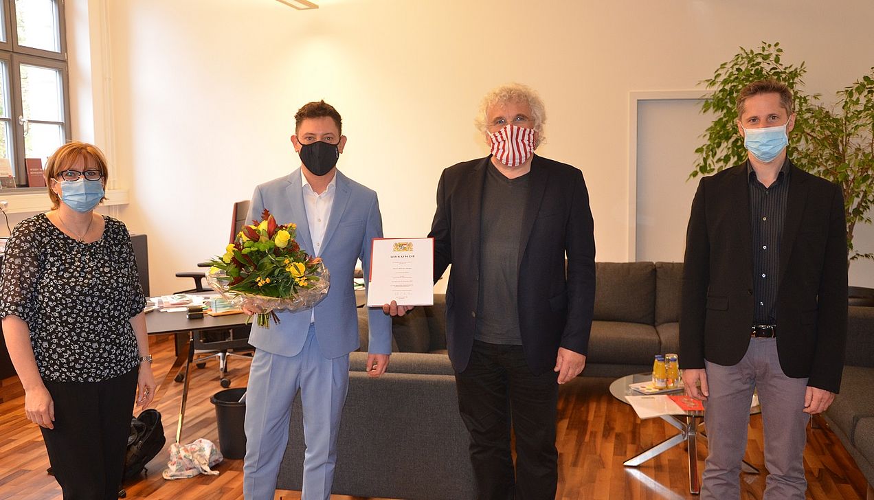 Am 02. November 2020 wurde Maurice Steger, Lehrender für Blockflöte, Solo-Blockflötist und Dirigent, vom Präsidenten der Hochschule für Musik Nürnberg zum Honorarprofessor ernannt. Unter Einhaltung der geltenden Hygienevorschriften wurde ihm die Ernennungsurkunde von Hochschulpräsident Prof. Christoph Adt im Beisein der Kanzlerin Claudia Döring und dem Vizepräsidenten Prof. Rainer Kotzian überreicht. Herzlichen Glückwunsch!