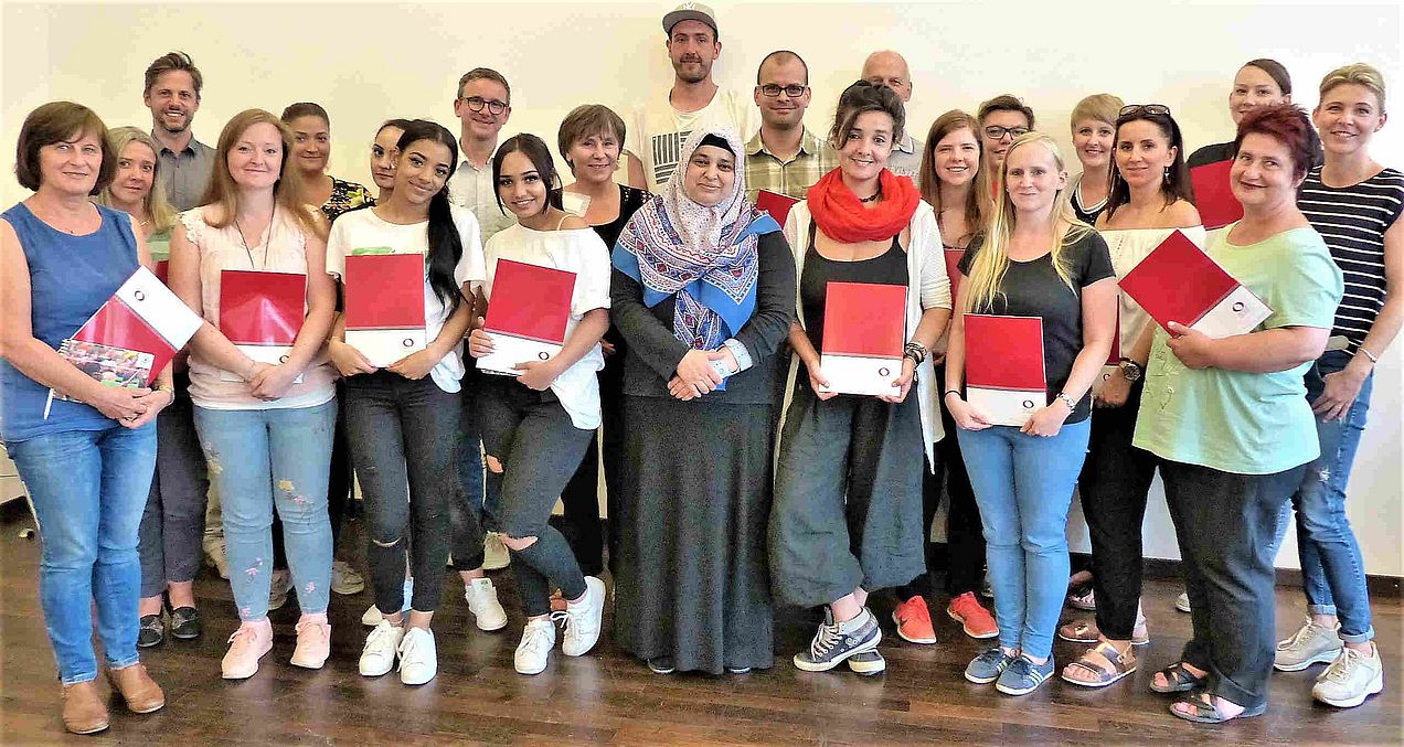 17 Erzieherinnen und 2 Erzieher erhielten zum Ende ihrer MUBIKIN-Fortbildung an der Hochschule für Musik Nürnberg ein Zertifikat für die erfolgreiche Teilnahme an acht eintägigen Modulen zu unterschiedlichen Aspekten Elementarer Musikpädagogik. Professor Rainer Kotzian, Vizepräsident der Hochschule für Musik, dankte seinen Mitarbeitern Doris Hamann und Michael Forster dafür, dass sie auch in der mittlerweile achten Fortbildungsrunde den Teilnehmer_innen geholfen haben, „sich selbst auf dem Gebiet des Elementaren Musizierens zu entwickeln“. Bei den sogenannten Aufbautagen sei es auch künftig möglich, sich auszutauschen. Helmut Gierse, Vorsitzender der Trägerversammlung MUBIKIN, bedankte sich bei den Teilnehmer_innen, „dass Sie diese Fortbildung angenommen haben“ und ermutigte sie, das Gelernte mit den Tandempartnern auszuprobieren.