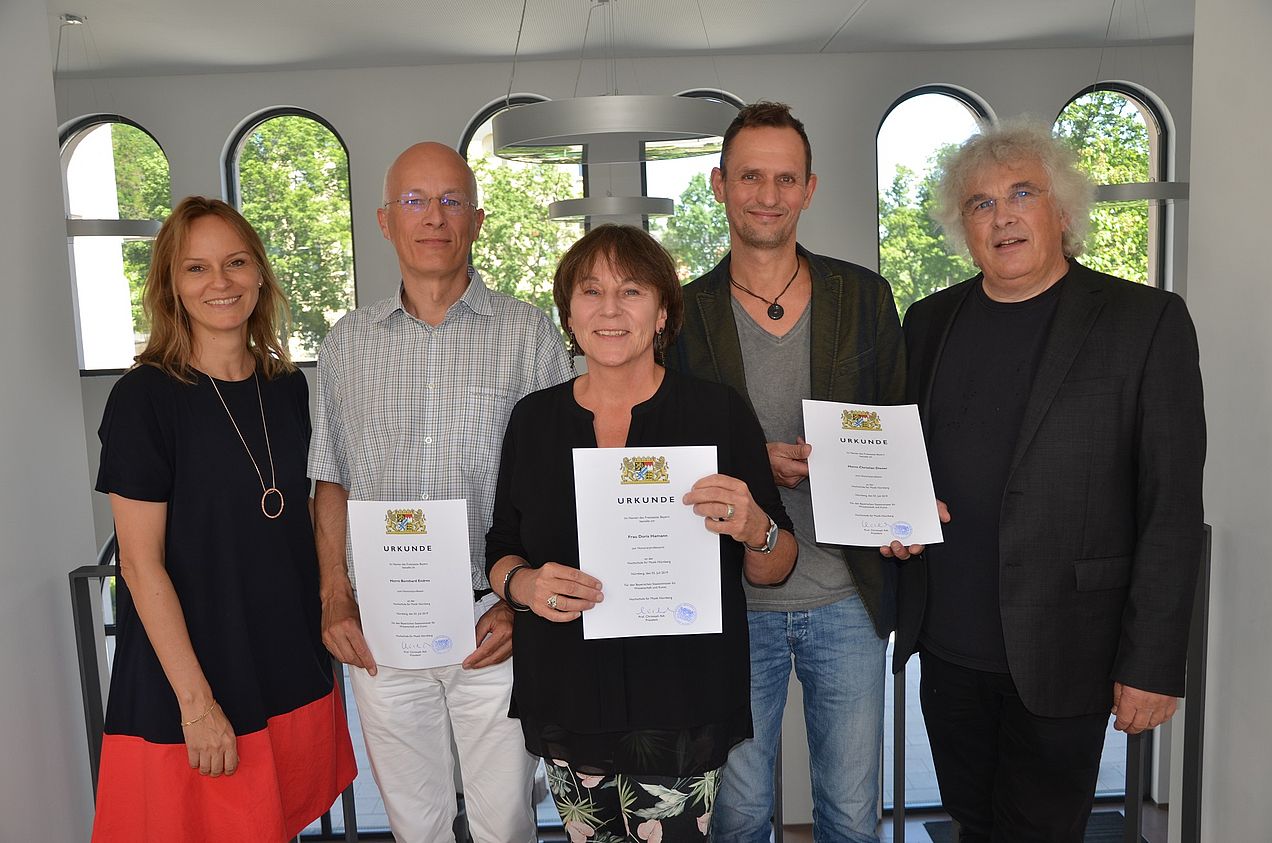 Bild links: Mit Wirkung vom 03. Juli 2019 erhielten Herr Prof. Christian Diener (2.v.r.), Jazz-Theorie, Herr Prof. Bernhard Endres (2.v.l.), Klavier und Frau Prof. Doris Hamann (3.v.r.), Elementare Musikpädagogik, in Anwesenheit der Vizepräsidentin Prof. Susanne Kelling und des Hochschulpräsidenten Prof. Christoph Adt eine Honorarprofessur der Hochschule für Musik Nürnberg.