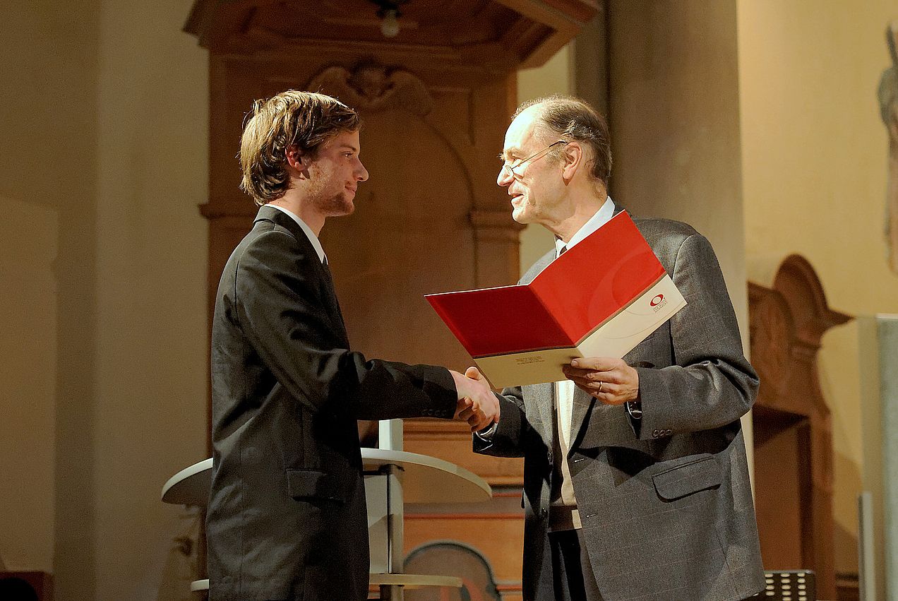 Die Gambistin Liana Pereira, die eines der zwei Deutschlandstipendien zugesprochen bekam, spielte in Begleitung von Prof. Bernward Lohr zu Beginn des Abends die Sonata in G-Dur für Viola da Gamba und Cembalo von Johann Sebastian Bach. Das zweite Deutschlandstipendium wurde an Michael Binder vergeben. Die Stipendiaten erhalten für ein Jahr monatlich 300,- Euro, wobei die Hälfte der Summe von privaten Spendern gestiftet und die andere Hälfte vom Bund ergänzt wird. Herzlicher Dank gilt dem Ehepaar Claus Rainer und Irmgard Doetsch für ihre großzügige Unterstützung!