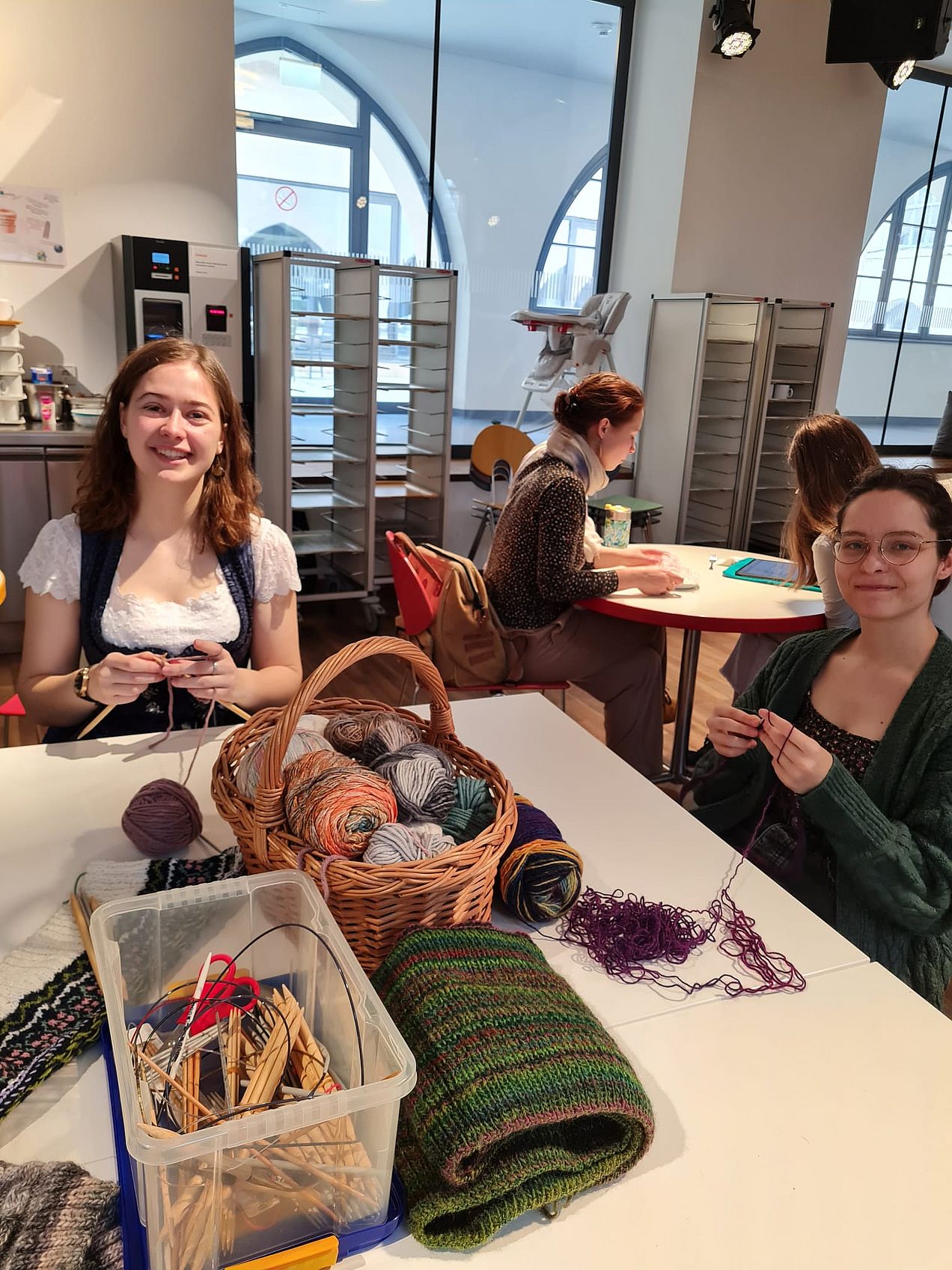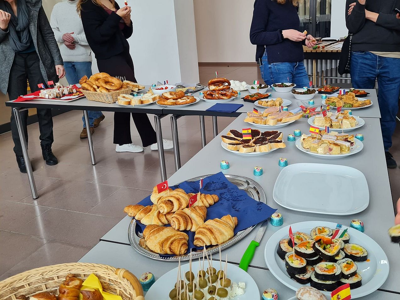 Stets unwägbar und zugleich entscheidender Faktor bei Veranstaltungen ist die Resonanz. Um möglichst allen die Teilhabe zu ermöglichen, konnten die Lehrenden mit ihren Lehrveranstaltungen die Angebote der Internationalen Woche besuchen. Davon haben zahlreiche Lehrende mit ihren Studierenden Gebrauch gemacht. Gleichzeitig war es dem Planungsteam ein Anliegen, die Thematik internationaler Kulturen in ihrer Sinnlichkeit erlebbar zu machen: zum einen durch Veranstaltungsorte des täglichen Beisammenseins wie der Mensa oder dem Foyer, zum anderen durch Kulinarik, wie beim internationalen Brunch oder durch das praktische Ausprobieren bei den DIY-Projekten. Hierbei bereiteten Lehrende, Studierende und Mitglieder der Verwaltung gemeinsam in der Verwaltungsküche fränkische Feuerspatzen und englische Scones zu, strickten, häkelten, bastelten Kreppblumen und knüpften in Makramee-Technik in der Mensa oder ließen sich im Foyer in die Kunst des Jonglierens einführen. Beim internationalen Brunch, der musikalisch von der Jazz-Abteilung und der Schlagzeug-Klasse umrahmt wurde, reichten die Tische kaum aus für die Fülle an mitgebrachten internationalen Spezialitäten.