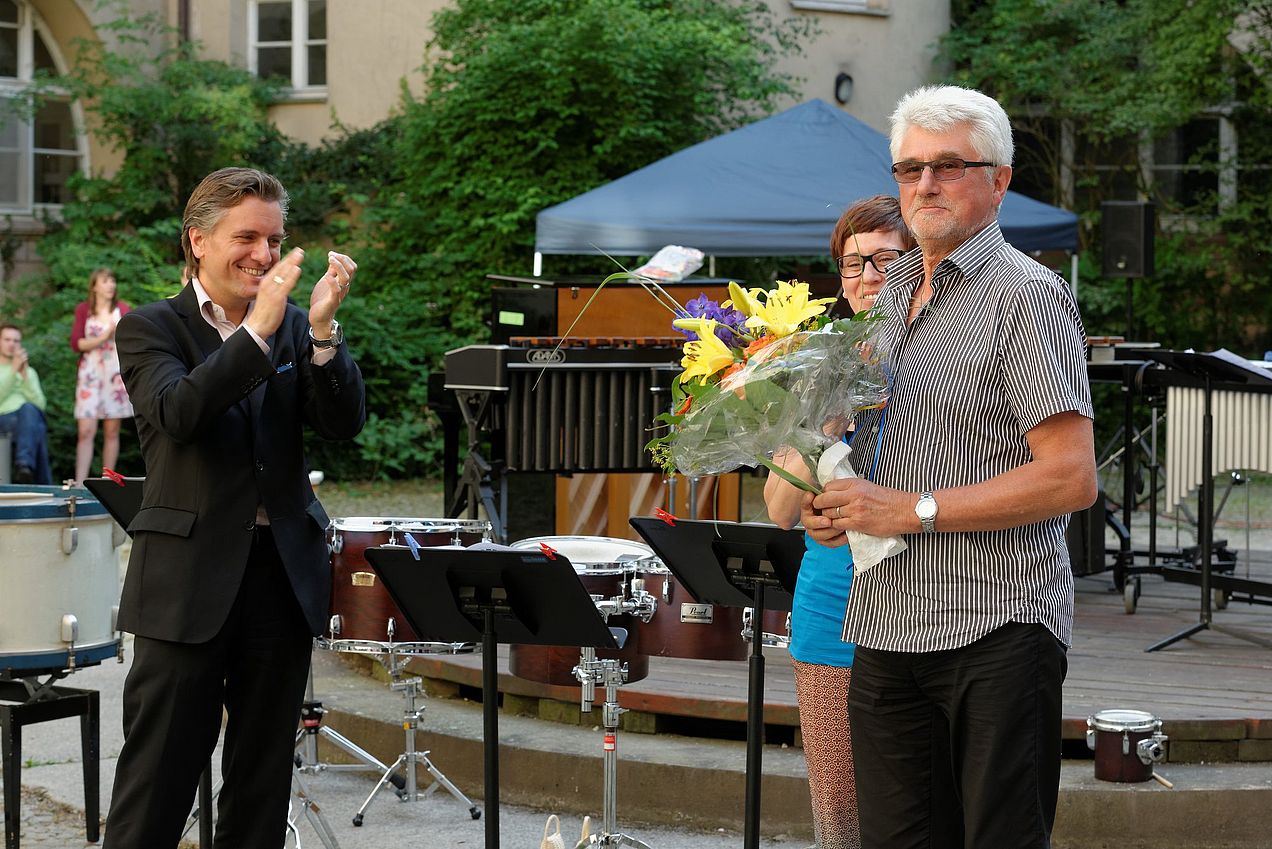 Im Rahmen des Sommerfestes wurden auch dieses Jahr wieder sehr verdiente Hochschulangehörige offiziell verabschiedet. Prof. Silvan Koopmann (Posaune und Bigbandleitung), Prof. Hermann Schwander (Percussion) und Prof. Werner Dörmann (Korrepetition) treten in den Ruhestand, wobei Letzgenannter weiterhin als Lehrbeauftragter an der Hochschule tätig sein wird. Frau Claudia Kruss, die zunächst als Veranstaltungsleiterin im Heilig-Geist-Saal, später im Kammermusikbüro der Hochschule tätig war, wird sich zukünftig anderen Aufgaben zuwenden. Die Hochschulleitung bedankte sich bei den vier engagierten und beliebten Mitarbeitern und wünscht ihnen im Namen der gesamten Belegschaft alles Gute für die Zukunft!