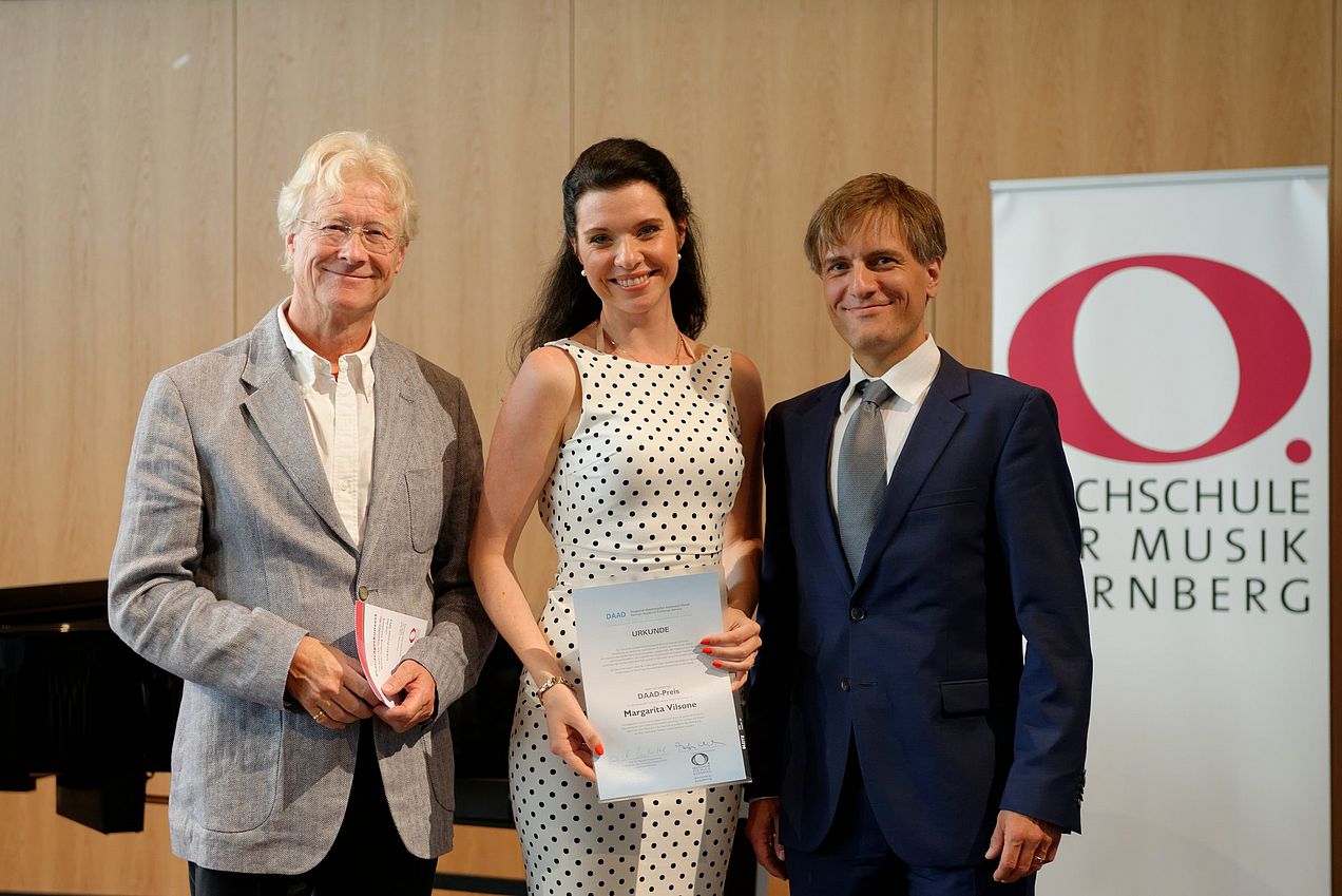 Am Donnerstag, dem 3. Juli 2014, wurden im Rahmen eines Konzertes im Heilig-Geist-Saal an herausragende Studentinnen und Studenten Preise und Stipendien verliehen. Prof. Dr. Martin Ullrich, Präsident der Hochschule für Musik Nürnberg, überreichte den diesjährigen DAAD-Preis an die lettische Sopranistin Margarita Vilsone (Klasse Prof. Dr. Jan Hammar).
