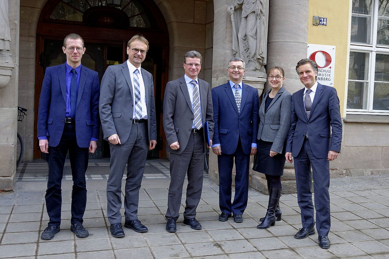 Am 30. Januar 2014 stattete Staatssekretär Bernd Sibler (3. v. l.), der im Bayerischen Staatsministerium für Bildung und Kultus, Wissenschaft und Kunst für die Bereiche Wissenschaft und Kunst zuständig ist, der Hochschule für Musik Nürnberg seinen Antrittsbesuch ab. Im Gespräch mit der Hochschulleitung informierte er sich über aktuelle Themen, wie die anstehende Generalsanierung, die Stellensituation an der Hochschule, die Situation der Lehrbeauftragten in Bayern und das Thema "Dritter Zyklus". Nach einem Rundgang durch das Hochschulgebäude wurden im Gespräch mit den Studierendenvertretern die Besonderheiten der jüngsten deutschen Musikhochschule erörtert.