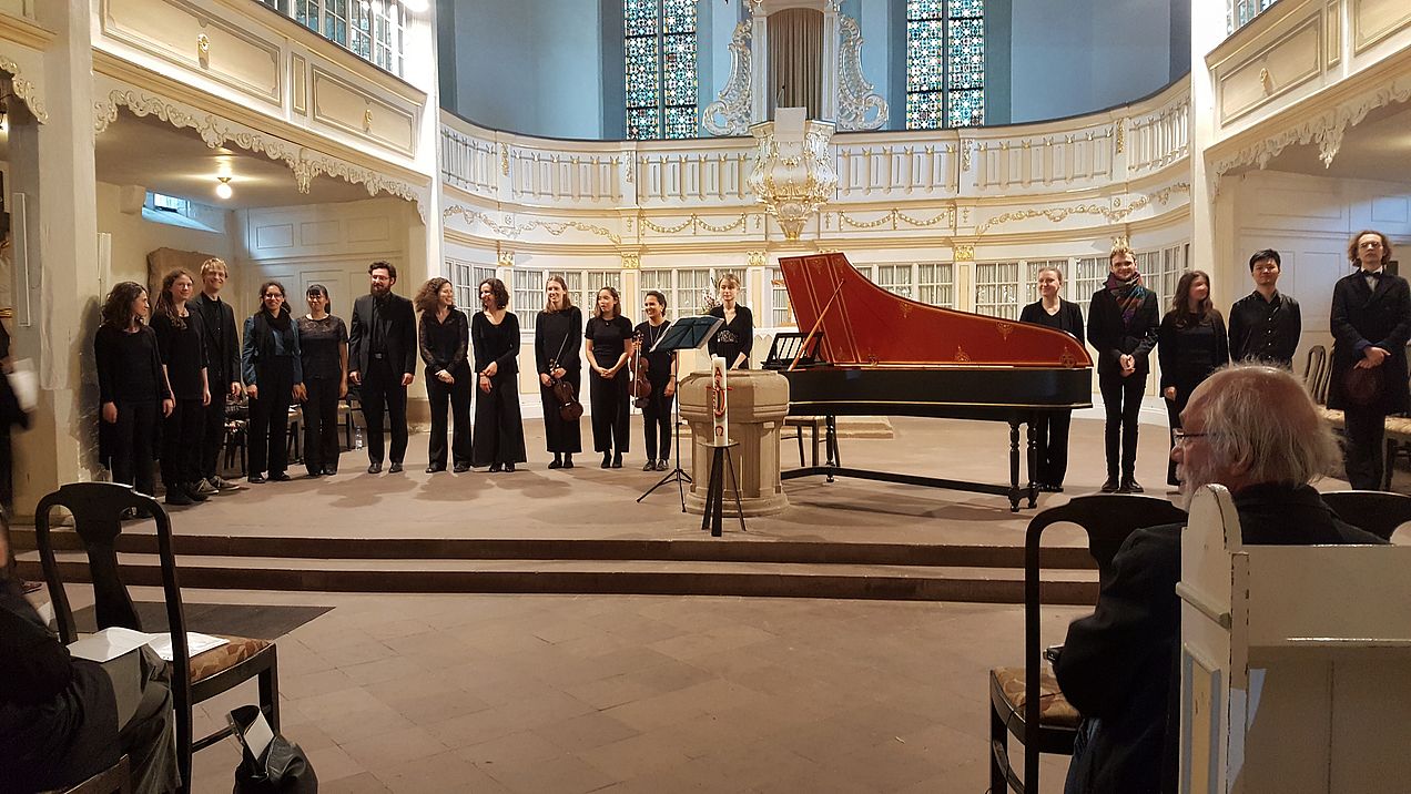 Vom 25. April bis zum 1. Mai fand ein bemerkenswertes Projekt in Zusammenarbeit mit der Musikhochschule Weimar statt: Unter der Leitung von Prof. Midori Seiler, Barockvioline, Prof. Bernhard Klapprott, Cembalo (beide Weimar) und Prof. Anne Röhrig, Barockvioline (Nürnberg) wurden alle sechs Sonaten für Violine und obligates Cembalo (BWV 1014–1019) von J. S. Bach erarbeitet. Zum Auftakt traf man sich zu einem intensiven dreitägigen Workshop in Weimar mit insgesamt 17 Studierenden der beiden Hochschulen (12 Geiger_innen und 5 Cembalist_innen). Im Anschluss folgten drei Konzerte mit jeweils allen sechs Sonaten, gespielt von allen Workshopteilnehmer_innen: Das erste Konzert fand in der berühmten Bach-Kirche in Arnstadt statt, das zweite im Studienzentrum der Anna Amalia Bibliothek Weimar und zuletzt, am 1. Mail, waren dann die Weimarer Musiker_innen zu Gast im Kammermusiksaal der HfM Nürnberg zum gemeinsamen Absschlusskonzert. Zuvor besuchten sie noch die Instrumentensammlung im Germanischen Nationalmuseum, kompetent geführt von den zuständigen Restauratoren.