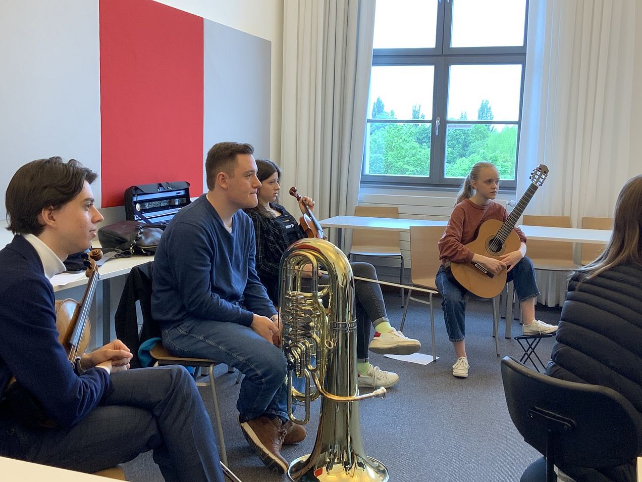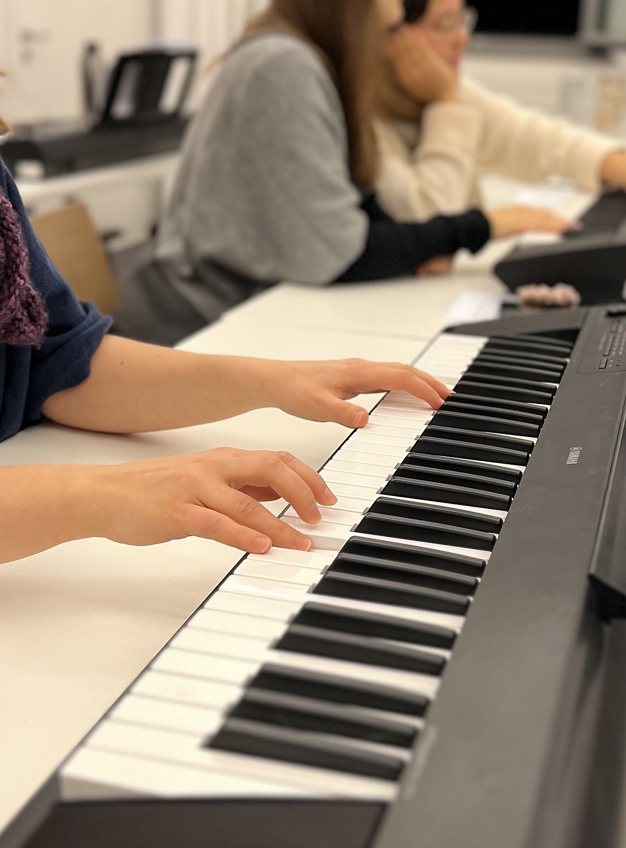 The aim of ear training is to become aware of one's own listening habits and to develop listening skills so that music can be perceived in a more differentiated and multi-layered way and discussed appropriately. Individual musical parameters are initially trained in small groups through exercises such as sight-singing, rhythmic speaking, dictation or style-based vocal improvisation. In the second year, the skills acquired are brought together and applied to pieces of music, analysing them through listening and comparing different interpretations.