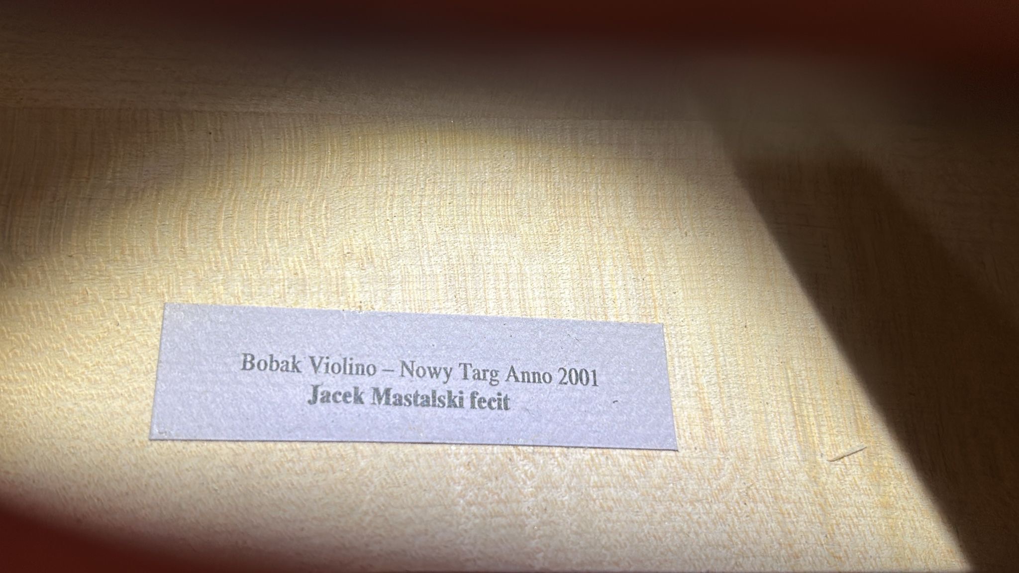 und strahlenden Klang besitzt. Das Instrument wurde im Jahr 2001 in der Werkstatt Bobak Violino in Polen ( Nowy Targ) gefertigt und ist ein Nachbau des berühmten Montagnana. Der Klang ist wunderbar hell, mit einer leichten