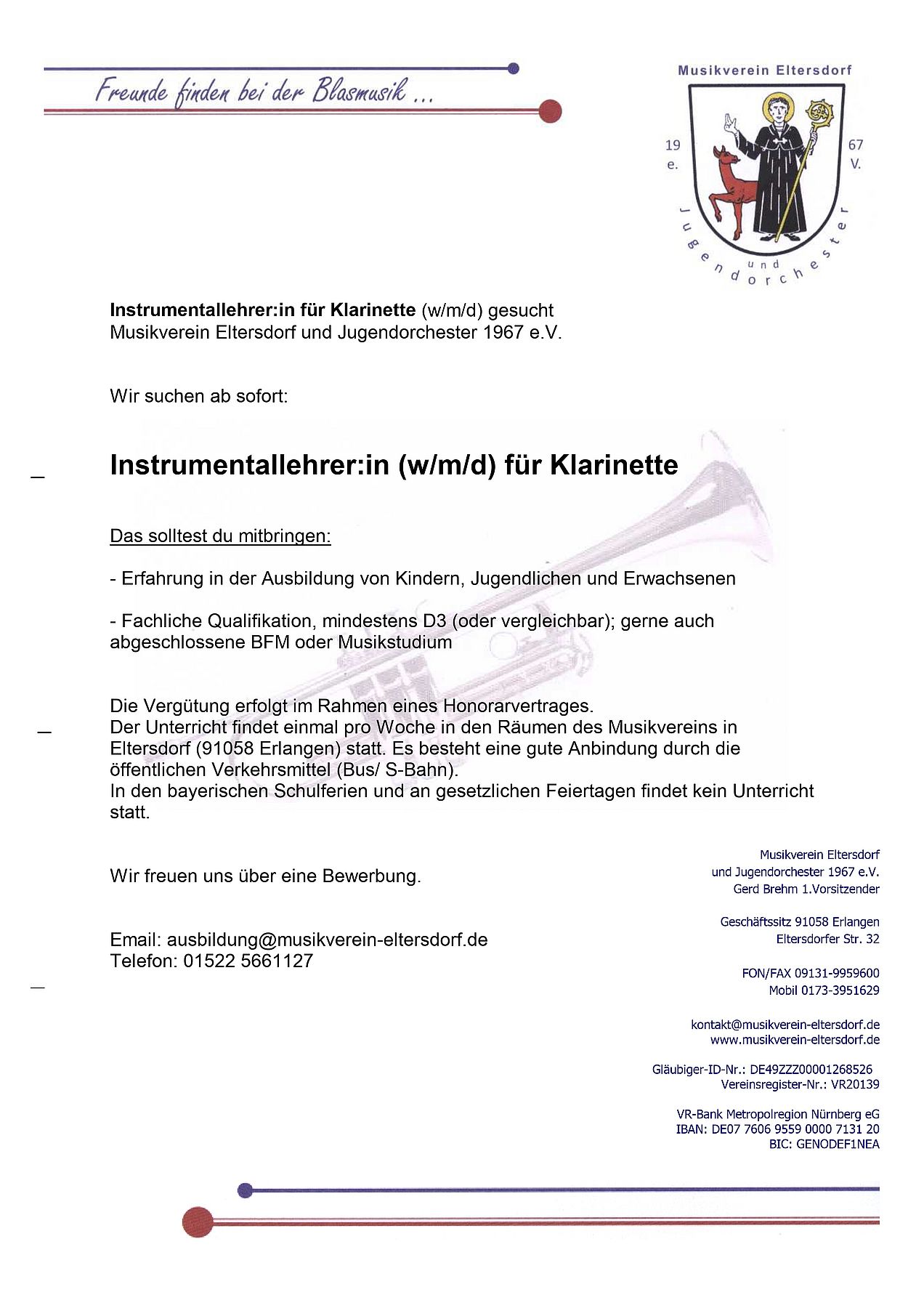 Wir suchen ab sofort eine:n Instrumentallehrer:in (w/m/d) für Klarinette.