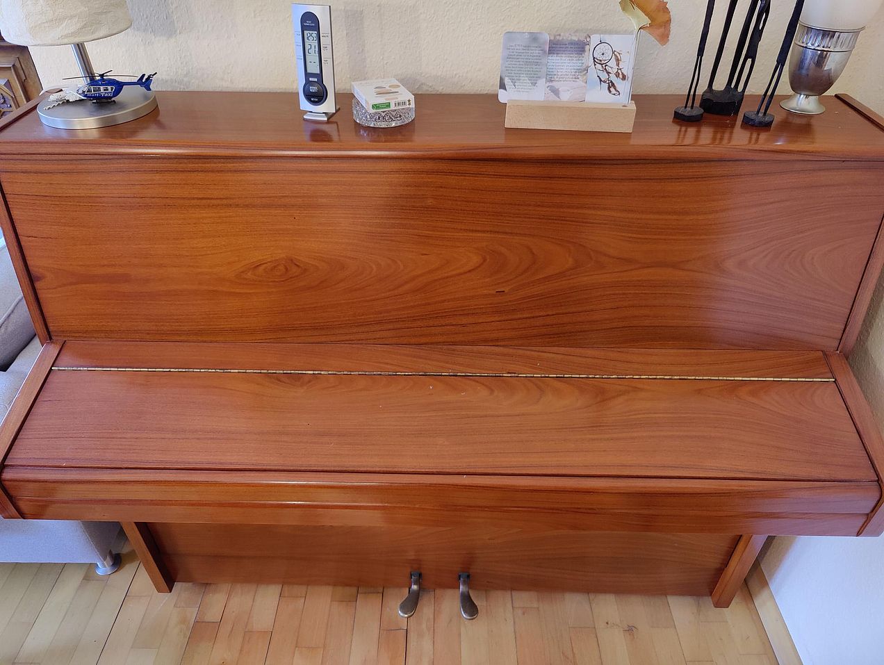 Das Gehäuse dieses Instruments besteht aus massivem Holz mit einer sehr schönen Maserung, die dem Klavier eine elegante und zeitlose Optik verleiht. Die Tastatur bietet ein angenehmes, gut ausbalanciertes Spielgefühl und eignet sich sowohl für Anfänger als auch für fortgeschrittene Pianisten. Alle Tasten und Pedale funktionieren einwandfrei, die Mechanik arbeitet präzise und zuverlässig. Das Klavier wurde stets gepflegt und befindet sich in einem gepflegten Zustand, mit nur leichten Gebrauchsspuren.