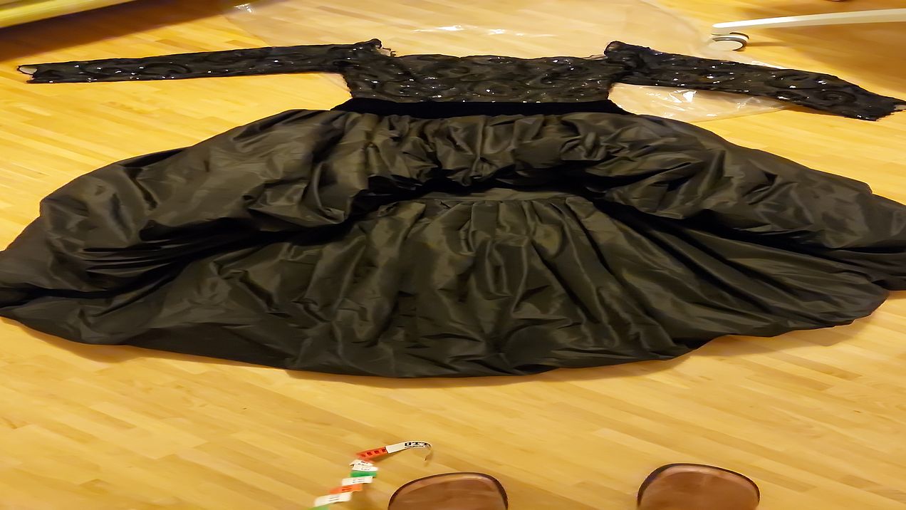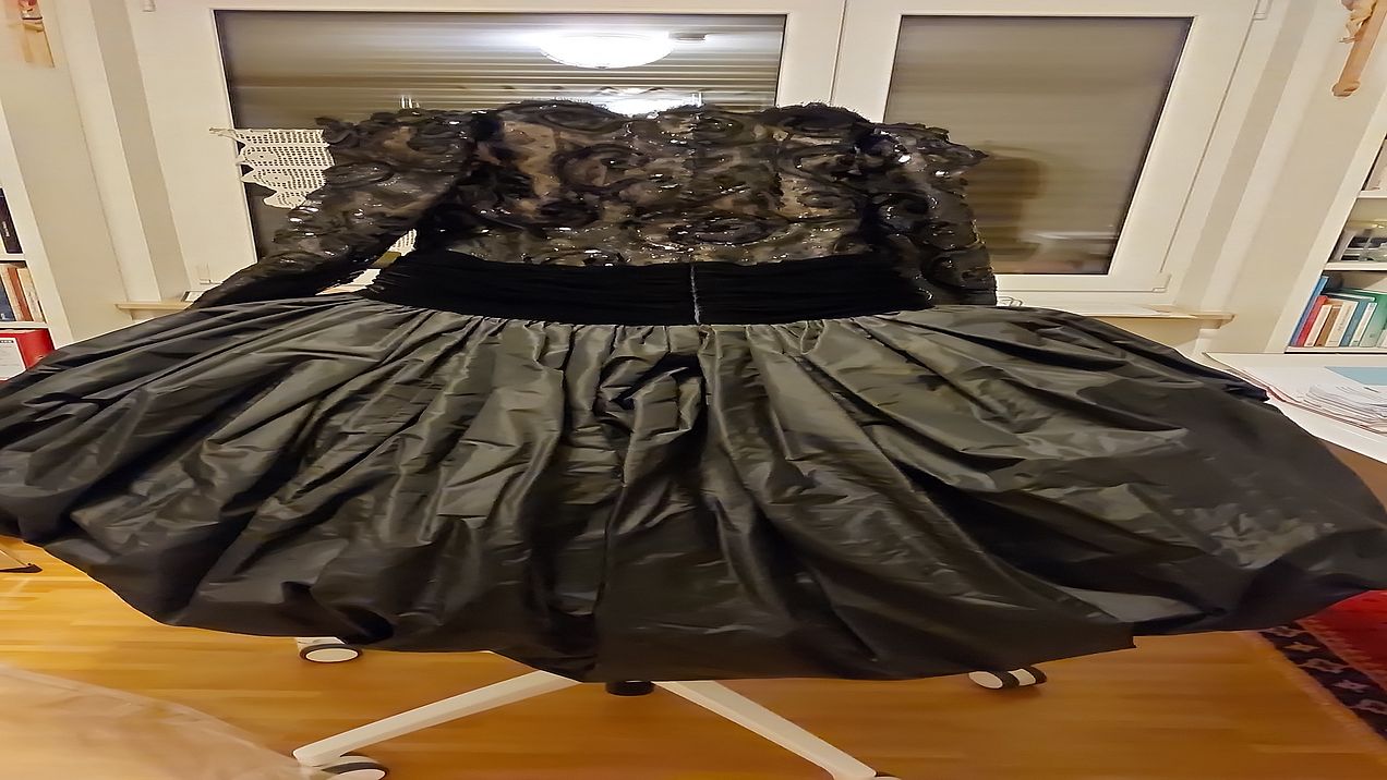 Traumhaft schönes Kleid für Ihren Gesangsauftritt: Größe 38, vorne kurz, hinten lang, schwarz, schulterfrei, lange Ärmel, Oberteil Spitze mit Futter unterlegt, Taille schwarzer Samt, Rock Tüll