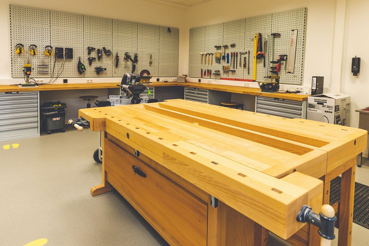 • Die Analogwerkstatt stellt eine Fülle an modernen Werkzeugen bereit, die es ermöglichen, handwerkliche Tätigkeiten auszuüben. Diese Werkstatt ist in zwei Bereiche unterteilt: Näh- und Holzwerkstatt. In diesen Räumlichkeiten können mithilfe einer breiten Auswahl an Feinwerkzeugen sowie Näh- und Stickmaschinen Modelle, Prototypen und auch umfangreichere Projekte umgesetzt werden. Darüber hinaus steht eine Lötstation zur Verfügung, die die Herstellung von Elektrobauteilen, Entlöten und die Multimeter-Messung relevanter Größen ermöglicht.