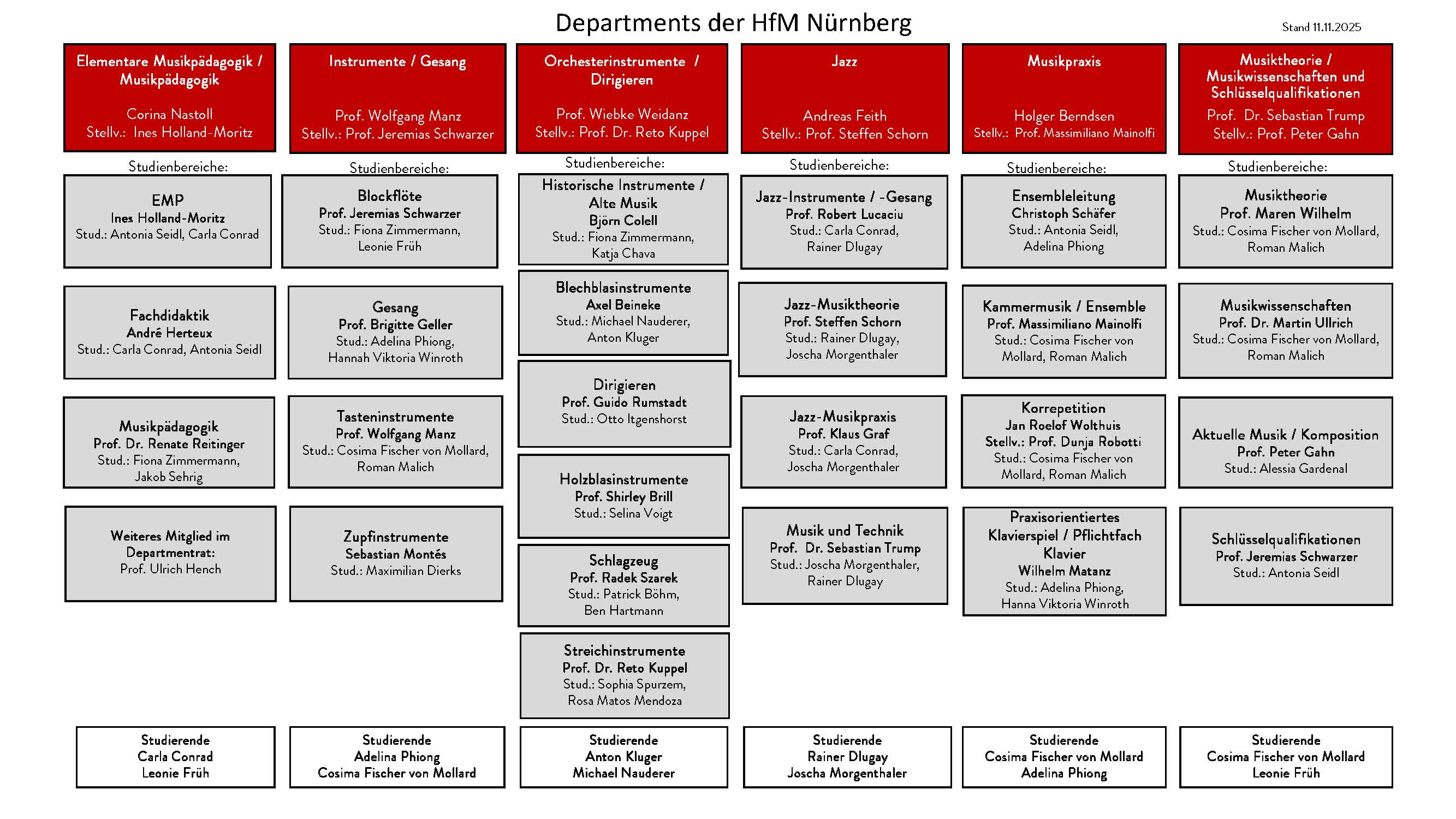 An der Hochschule für Musik Nürnberg werden 6 Departments als wissenschaftliche und künstlerische Einrichtungen gebildet.