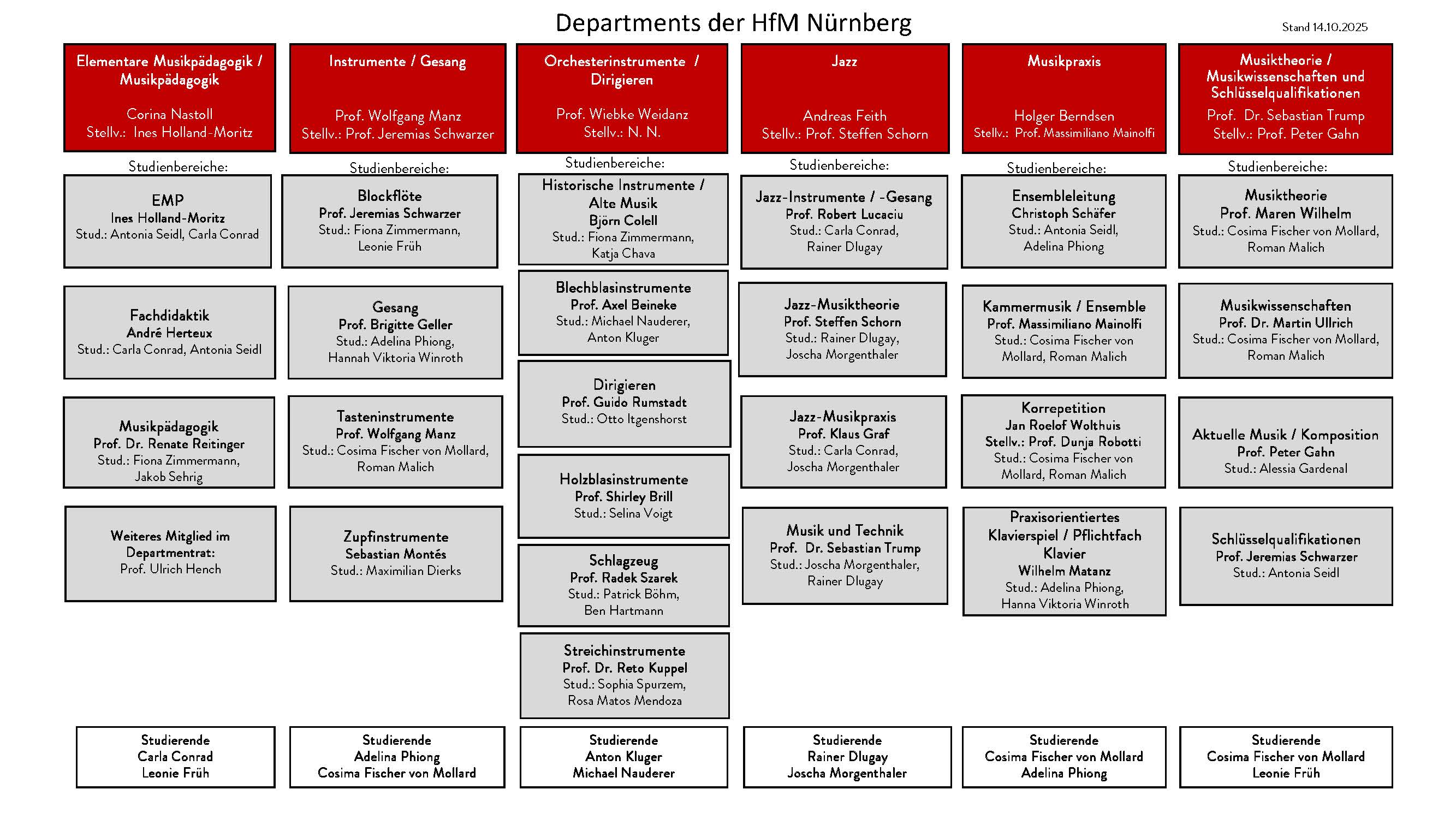 An der Hochschule für Musik Nürnberg werden 6 Departments als wissenschaftliche und künstlerische Einrichtungen gebildet.